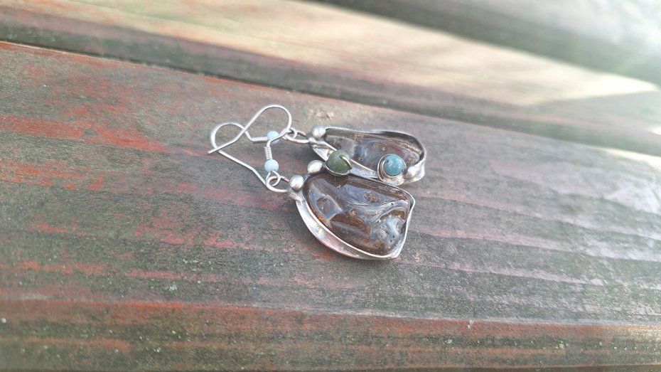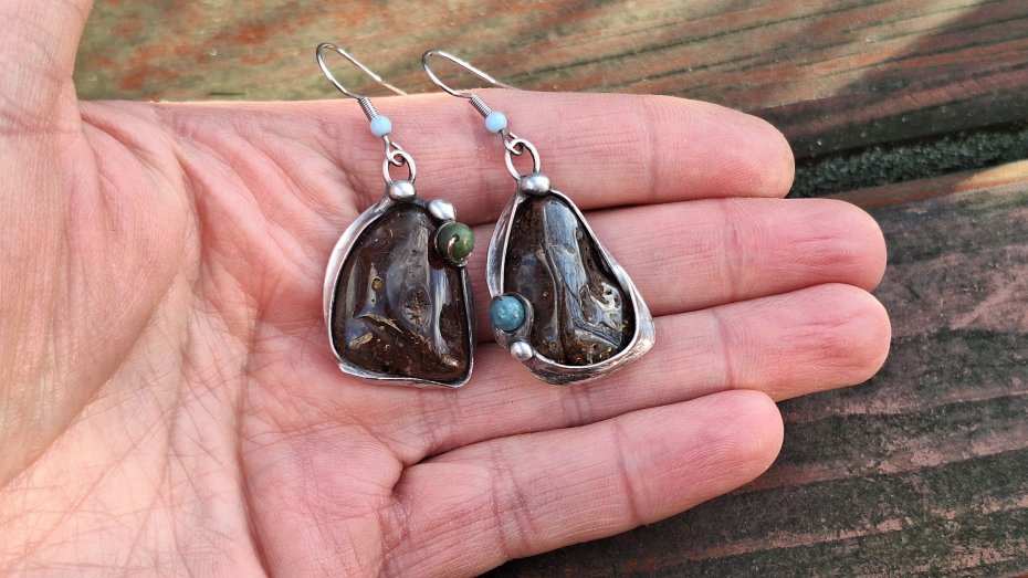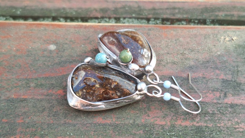 Kolczyki wykonane z miedzi, cyny, turmalinów i bursztynów. Długość ok. 5 cm z biglem, szerokość ok. 2 cm. Kolczyki nie są idealnie równe. Bigle metalowe.