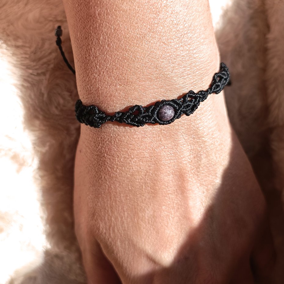Artystyczna kompozycja kamieni naturalnych oprawionych techniką mikromakramy z wykorzystaniem sznurka o doskonałej jakości.
