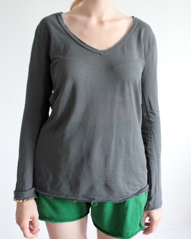 Grafitowa bluzka luksusowej marki American Vintage, która przykuwa uwagę detalami w postaci (bardzo) surowego wykończenia dołu bluzki, rękawów i dekoltu. Materiał to nietypowa w dotyku, lekko śliska bawełna.
