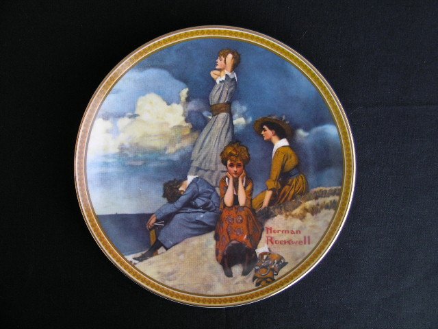 Kolekcjonerski talerz dekoracyjny, sygnowany jakością najstarszej amerykańskiej manufaktury porcelanowej Knowles. Zdobiony ilustracją znanego malarza Normana Rockwella z serii Rediscovered Women. Wartość kolekcjonerska - talerz indywidualnie sygnowany numerem 15214H, notowany na międzynarodowej liście Bradexu (84-R70-4.2). Wysoka jakość nadruku i porcelany. Na sukience siedzącej frontem kobiety dwa zadrapania. Wierne oddanie oryginalnej ciekawej kolorystyki Normana Rockwella. 22 x 2,5 cm. Stan zachowania dobry plus.