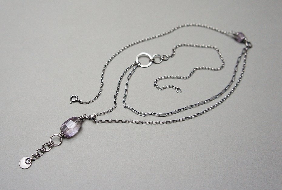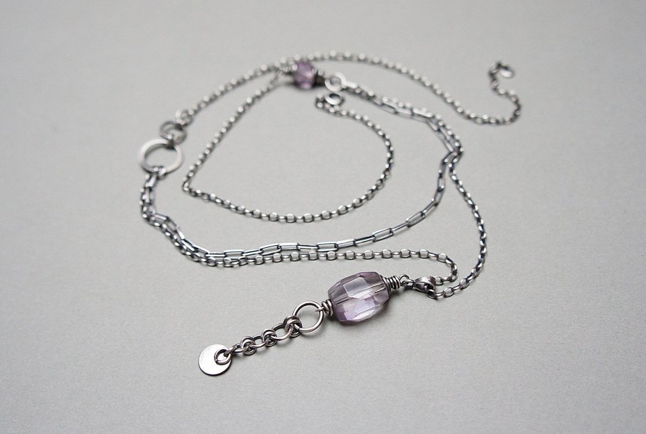 Naszyjnik wykonany ze srebra [pr. 925] w połączeniu z kuleczką fasetowanego ametrynu [8mm] oraz fasetowana bryłką ametrynu [15mm] . Całość oksydowana i przetarta. Długość naszyjnika około 62cm [po dłuższym obwodzie ].