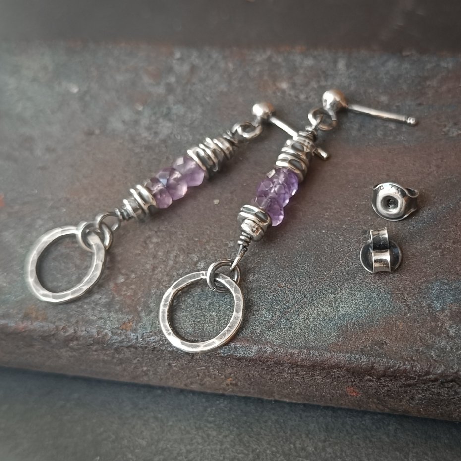 Kolczyki zostały wykonane ze srebra ze oraz z naturalnego ametystu w jasnofioletowym kolorze.