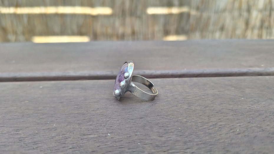 Pierścionek wykonany z miedzi, cyny i ametystu. Wymiary ok. 2.2 na 1.8 cm. Regulowany. Nie jest ciężki.