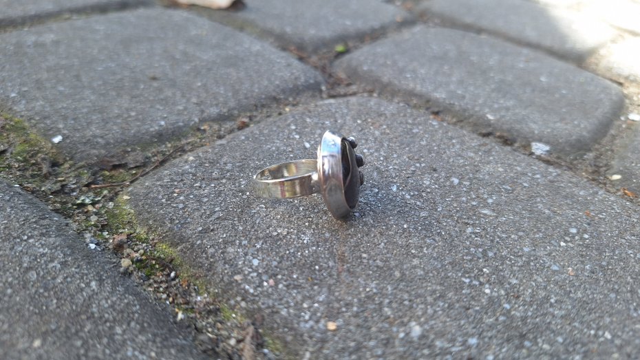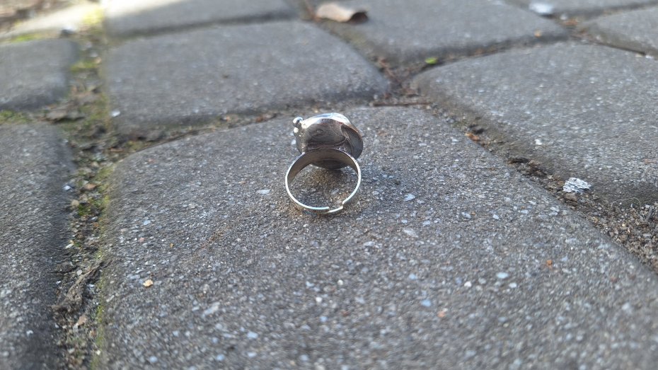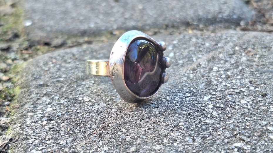 Pierścionek wykonany z miedzi, cyny i ametystu. Wymiary ok. 2 na 1.7 cm. Regulowany. Nie jest ciężki.
