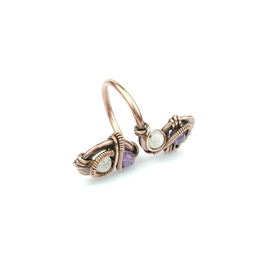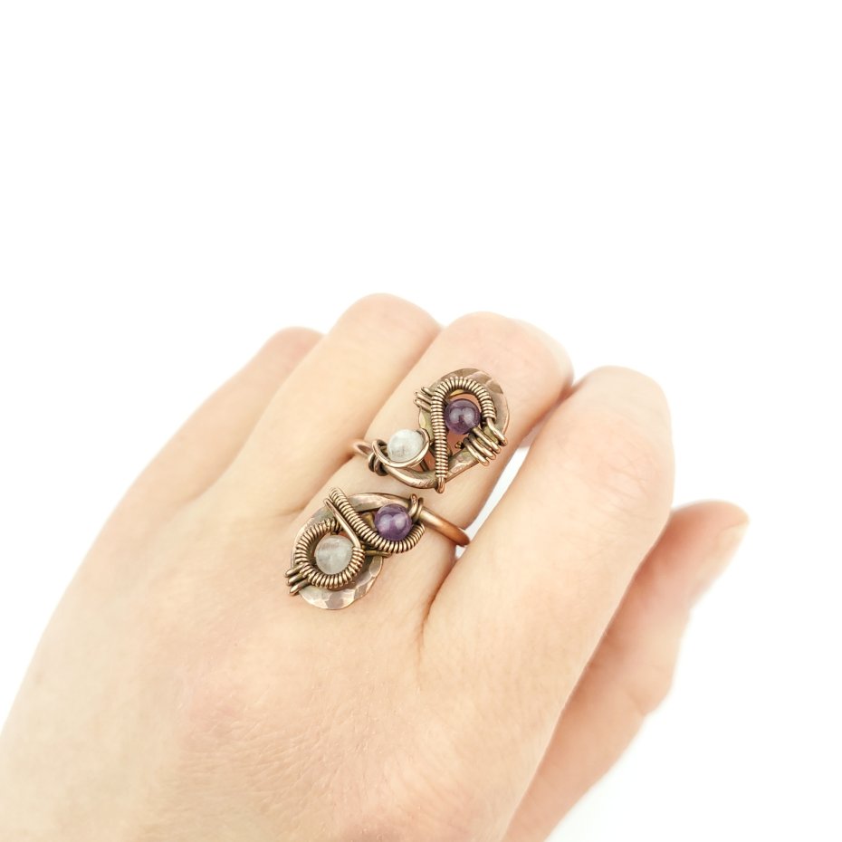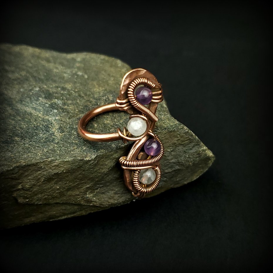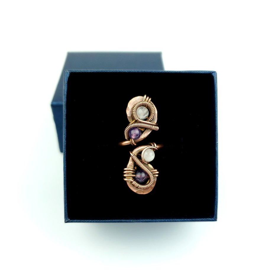 Pierścionek wykonany w pracochłonnej technice wire wrappingu. Obrączka gładka, góra wykonana z fakturowanej miedzi. W oplocie połyskują kamienie: ametyst i różowy kwarc. Pierścionek z małą regulacją - rozmiar optymalny 13 - 15 (obwód 53 mm -55 mm).