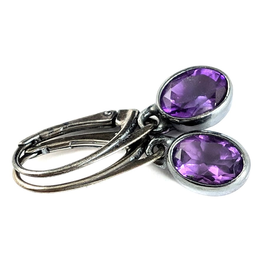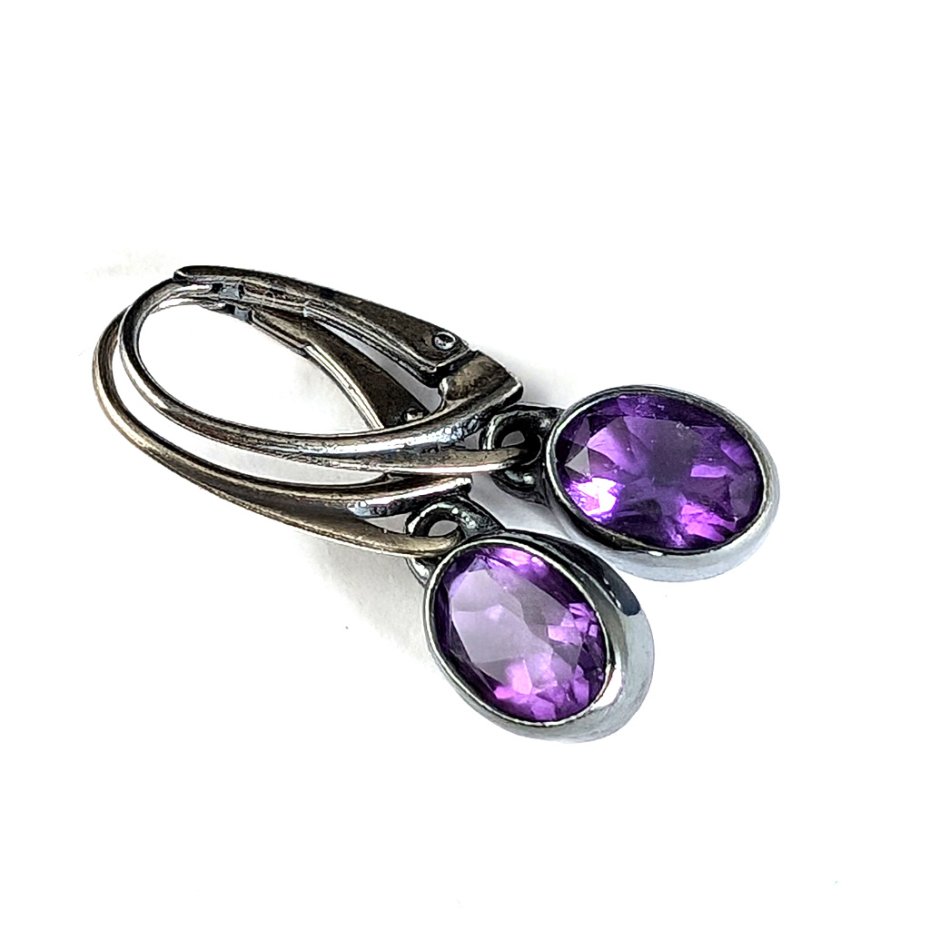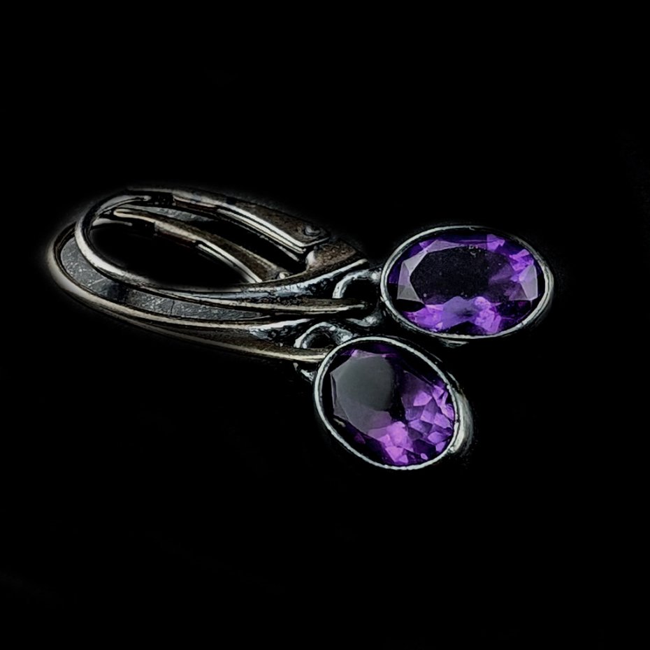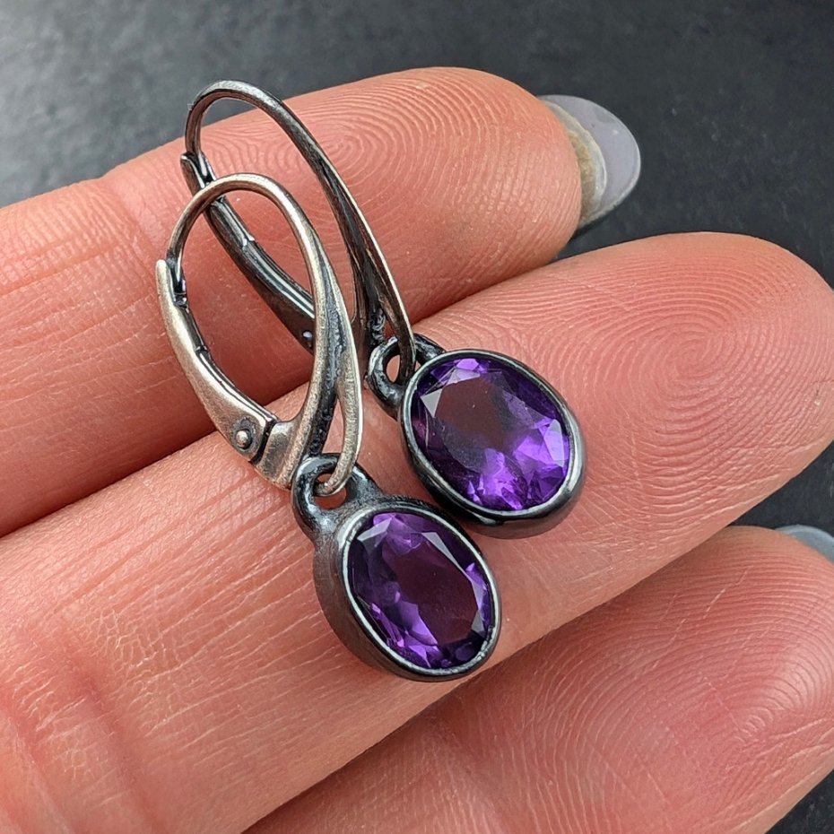 Eleganckie i subtelne kolczyki wykonane z oksydowanego srebra 925 oraz pięknych ametystów. Kamienie zachwycają piękną barwą spotęgowaną precyzyjnym szlifem. Wymiary elementów oprawy kamienia 10 x 7 mm. Zapinane na klasyczne bigle angielskie. Długość całości z biglami 28mm. Leciutkie,waga jednego kolczyka 1,46 grama. Kolczyki zostaną zapakowane w ozdobne pudełeczko.