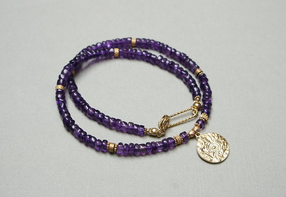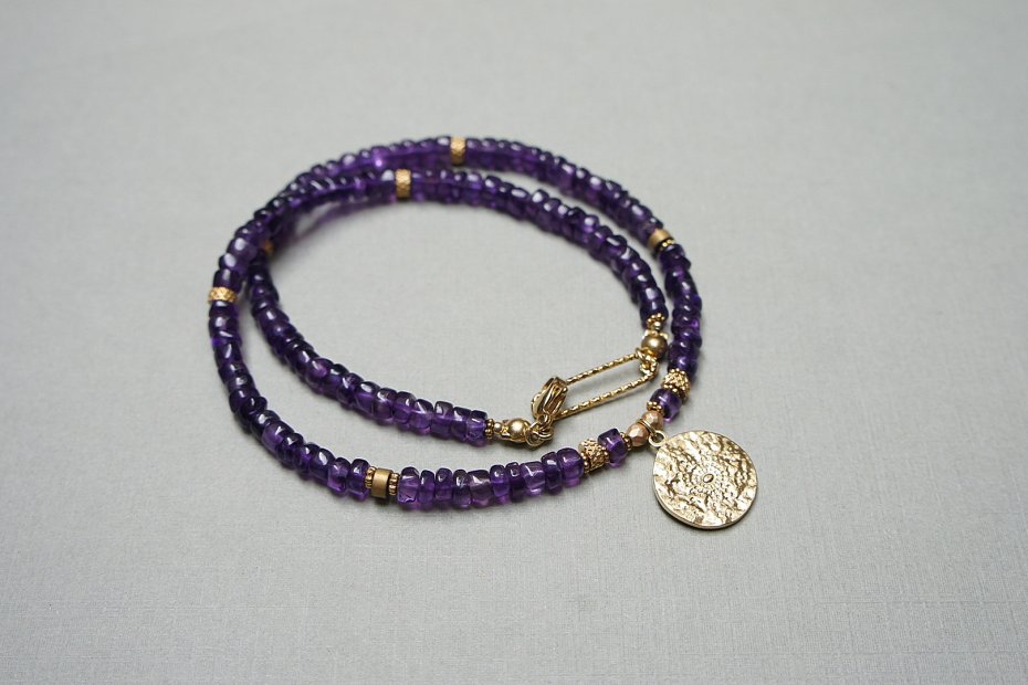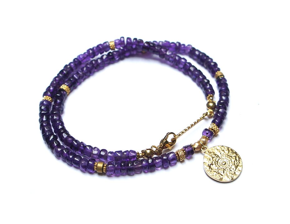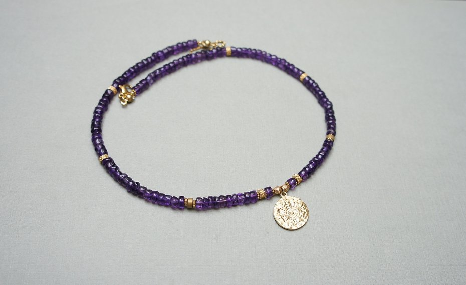 Krótki, delikatny naszyjnik wykonany z pozłacanej stali szlachetnej oraz naturalnych, szlachetnych kamieni - talarki nieregularnego ametystu [4 x 2mm,] przekładek z matowego hematytu [4 x 2mm], hematytu fasetowanego, platerowanego [3mm]. Naszyjnik o długości ok. 42cm.