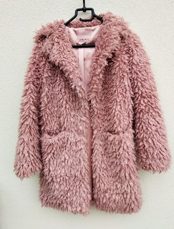 Miłe, mięciutkie, puszyste sztuczne futerko w kolorze dymnego różu. Z kołnierzem z rewersami, z dwiema wpuszczanymi kieszeniami. zapinane na dwie oblekane tkaniną zatrzaski. Całość na podszewce.