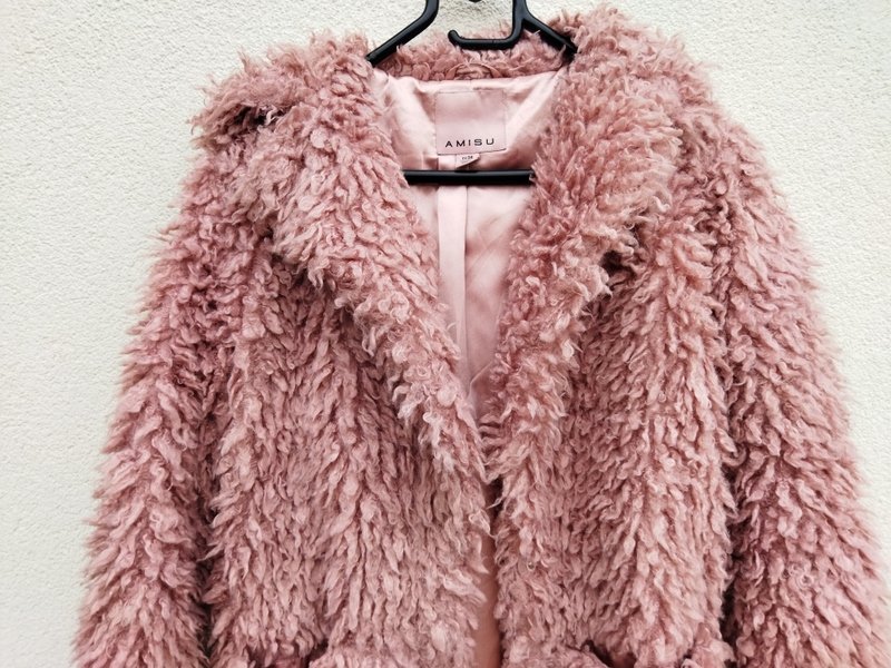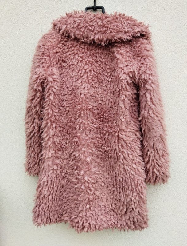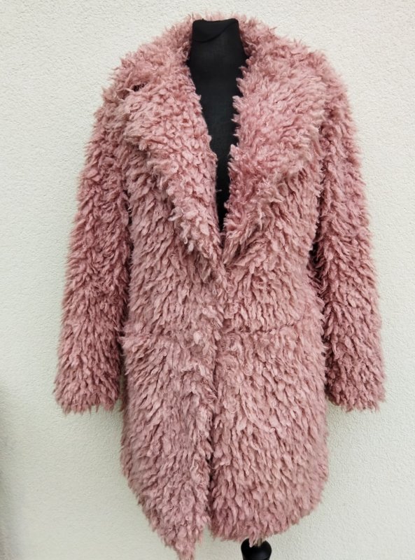 Miłe, mięciutkie, puszyste sztuczne futerko w kolorze dymnego różu. Z kołnierzem z rewersami, z dwiema wpuszczanymi kieszeniami. zapinane na dwie oblekane tkaniną zatrzaski. Całość na podszewce.