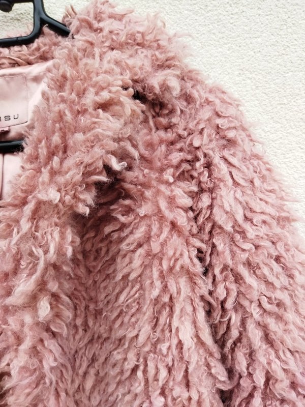 Miłe, mięciutkie, puszyste sztuczne futerko w kolorze dymnego różu. Z kołnierzem z rewersami, z dwiema wpuszczanymi kieszeniami. zapinane na dwie oblekane tkaniną zatrzaski. Całość na podszewce.