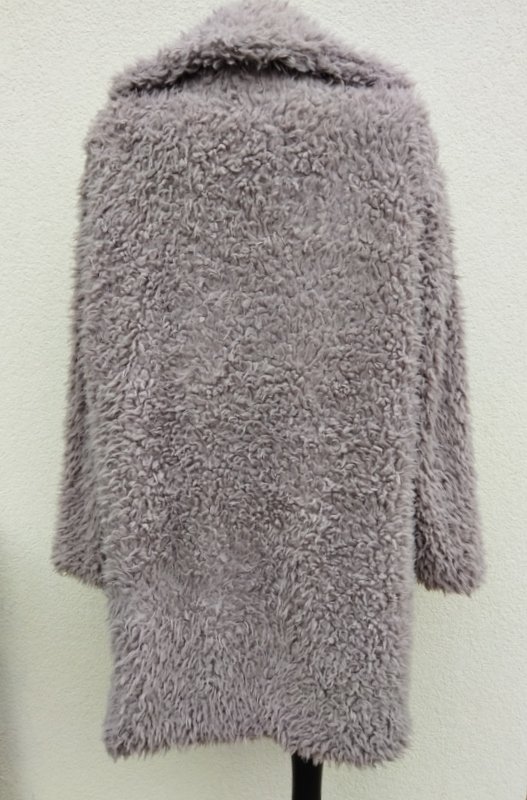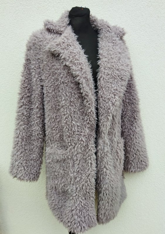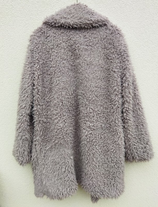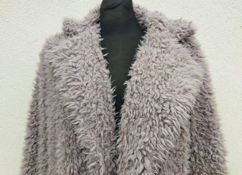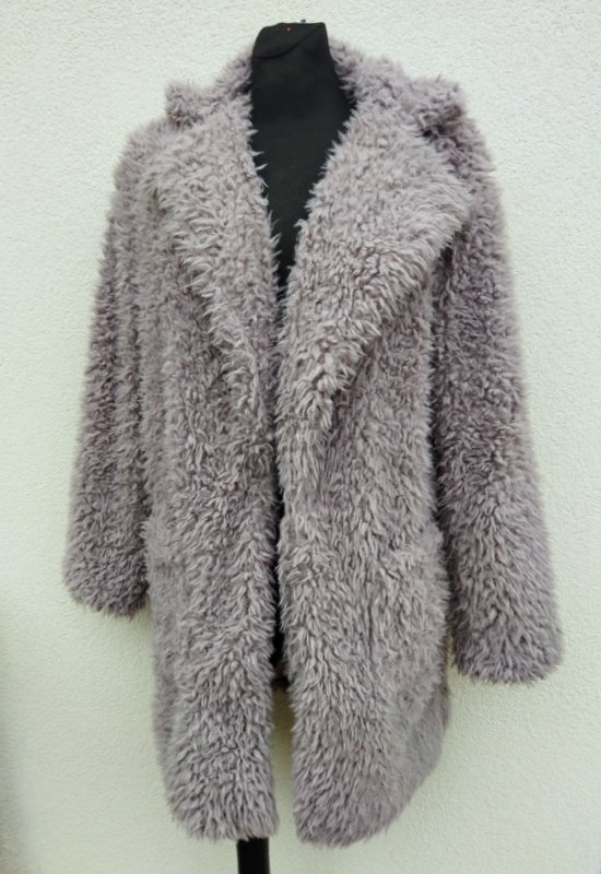 Płaszcz/ dłuższa kurtka ze sztucznego kudłatego futerka w zgaszonym wrzosowym kolorze. Minimalistyczny prosty krój z kołnierzem z rewersami, z dwiema naszywanymi kieszeniami. zapinana na jedna metalowa zatrzaskę. całość na podszewce. Mięciutka, wygodna i niezwykle lekka