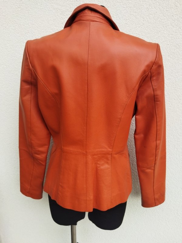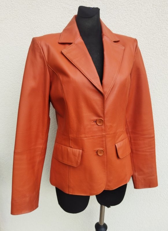 Zgrabna marynarka lub kurtka z miękkiej naturalnej skóry licowej w rudym kolorze. Taliowana, odcinana w pasie , z kołnierzem z rewersami, z dwiema wpuszczanymi kieszeniami z patkami. Zapinana na dwa guziki. Całość na podszewce.