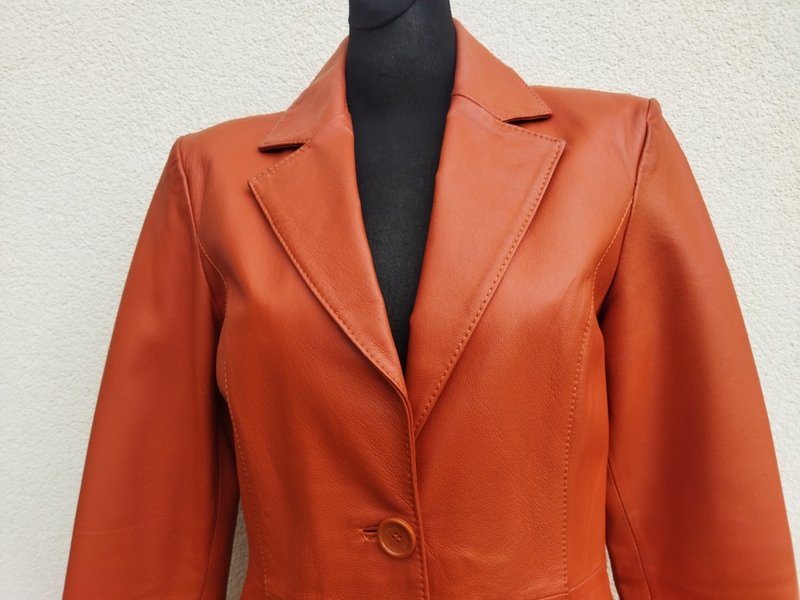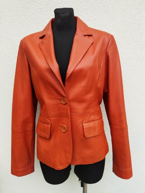 Zgrabna marynarka lub kurtka z miękkiej naturalnej skóry licowej w rudym kolorze. Taliowana, odcinana w pasie , z kołnierzem z rewersami, z dwiema wpuszczanymi kieszeniami z patkami. Zapinana na dwa guziki. Całość na podszewce.
