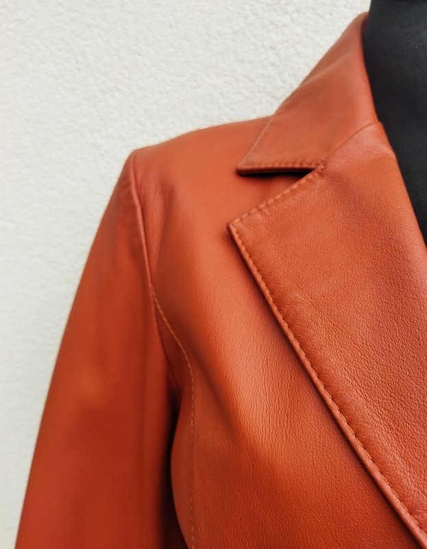Zgrabna marynarka lub kurtka z miękkiej naturalnej skóry licowej w rudym kolorze. Taliowana, odcinana w pasie , z kołnierzem z rewersami, z dwiema wpuszczanymi kieszeniami z patkami. Zapinana na dwa guziki. Całość na podszewce.