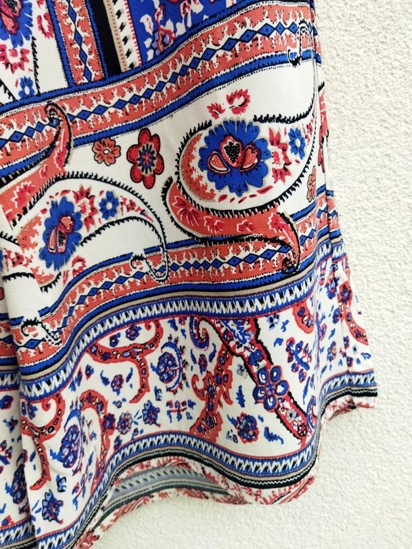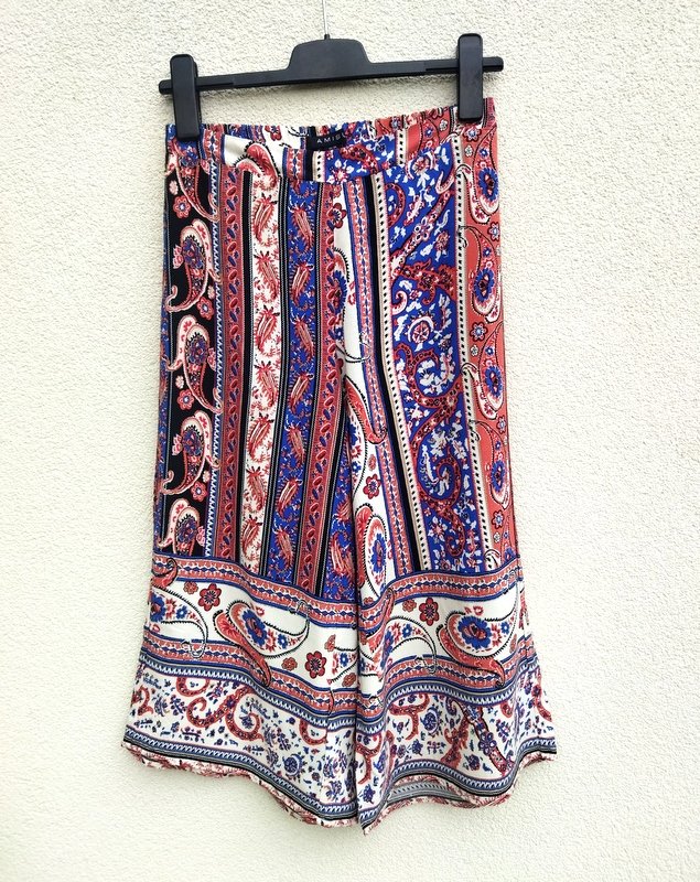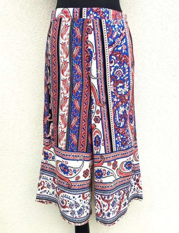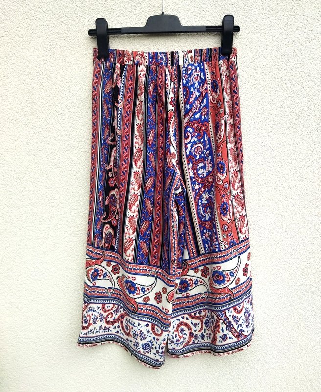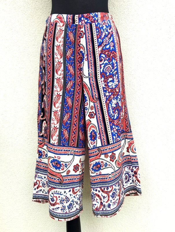 Wzorzyste spodnie typu kuloty z wiskozowej tkaniny w etniczne wzory w żywej kolorystyce. Na pasku w talii z wszytą gumą z tyłu.