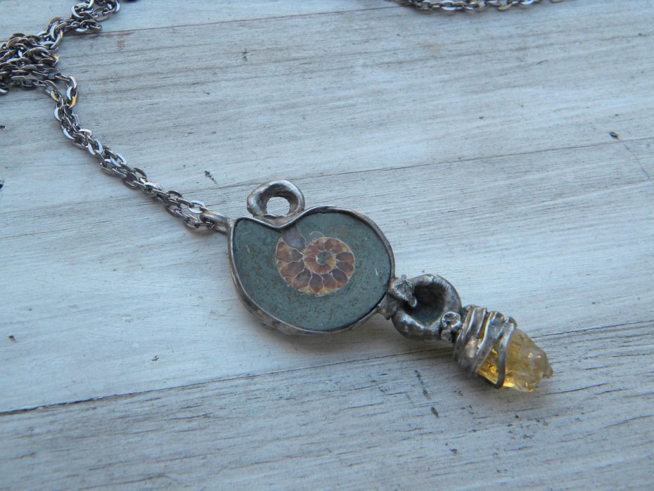 amonit i surowy cytryn w oprawie z ocynowanej miedzi