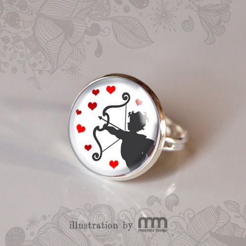 Pierścionek Amorek to bardzo kobiece i malutkie dzieło sztuki, które łączy nowoczesność z odrobiną antycznego powiewu. Obrazek pod szkiełkiem to autorska ilustracja. Pierścionek jest regulowany, można dopasować do palca.