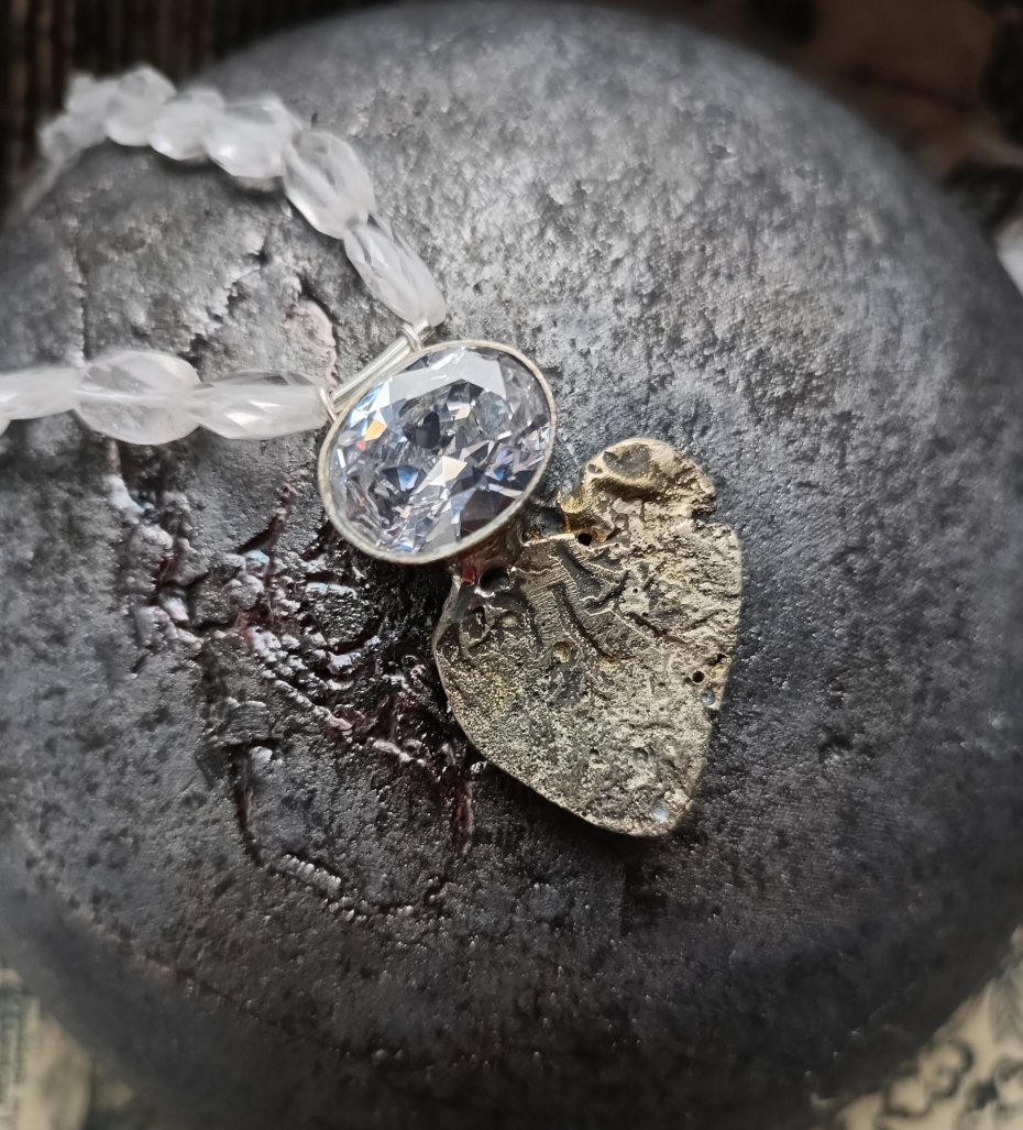 Unikatowy amulet z cudownie szlifowanym cyrkonem ,oprawiony nowym srebrem z kawałkiem topionego nowego srebra . Naszyjnik wisi na sznurze oliwkowo szlifowanych kryształów górskich . Całość wykończona jest nowym srebrem .
