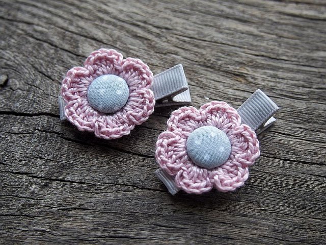 Kwiatki są zrobione na szydełku i ozdobione ręcznie robionym guzikiem. Średnica kwiatka wynosi ok. 3,5 cm