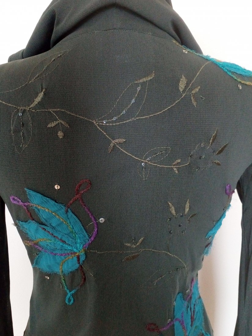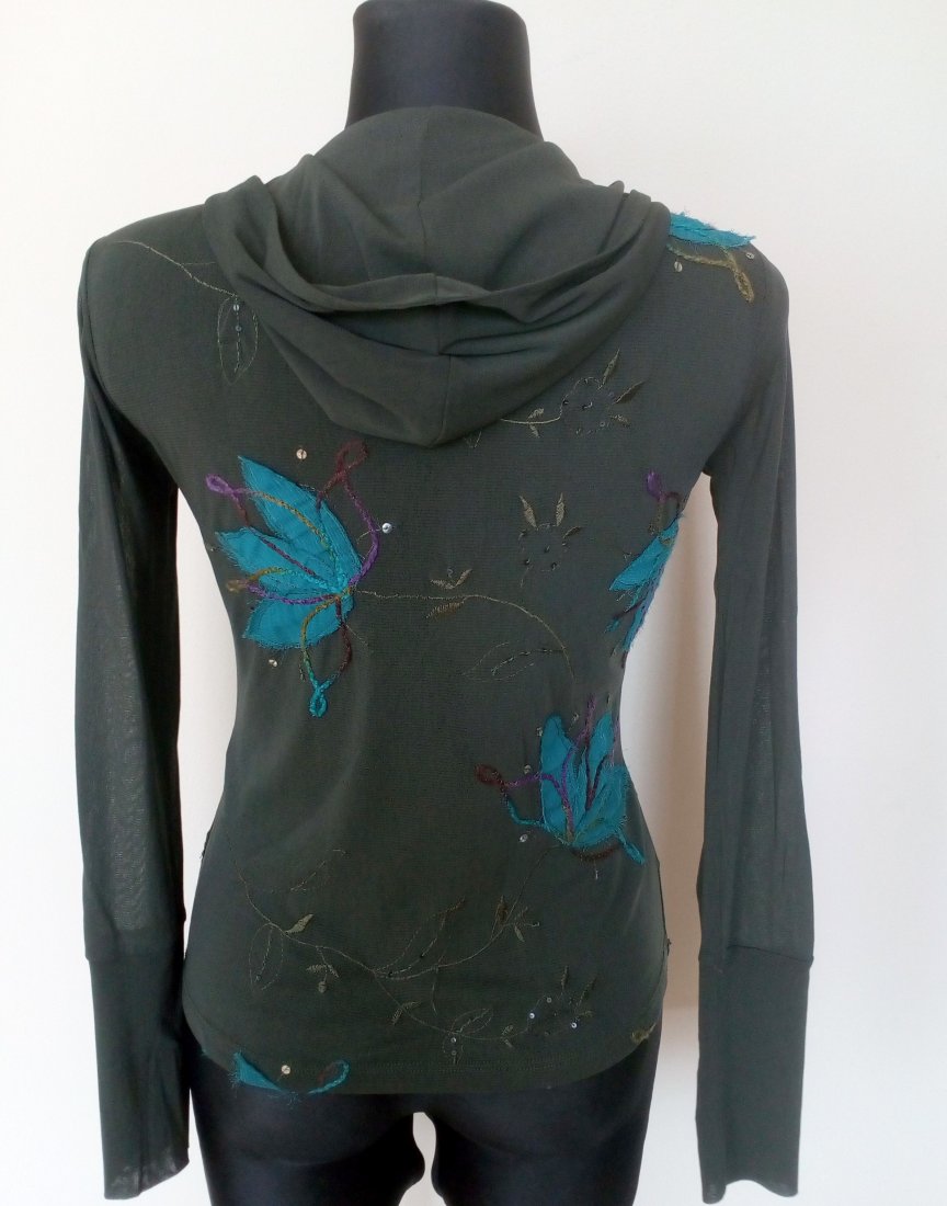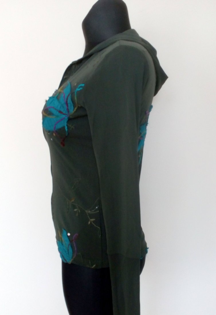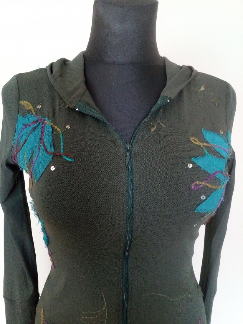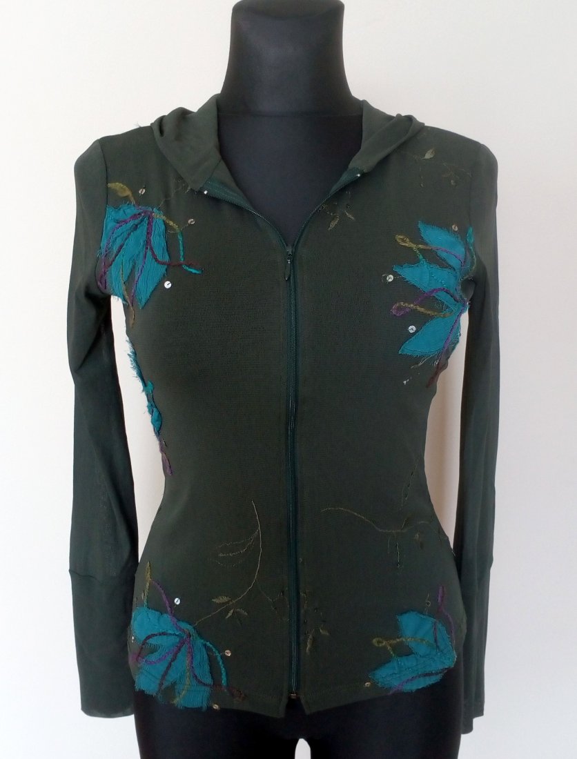Ciekawa bluza uszyta z podwójnej warstwy siateczkowego materiału w kolorze ciemnej butelkowej zieleni, zapinana na zamek, z kapturem na plecach, rękaw wąski z doszywanym wysokim mankietem, przód i tył bluzy zdobiony kwiatowymi aplikacjami z kreszowanej tkaniny w turkusowym kolorze, pojedynczymi cekinami i haftem