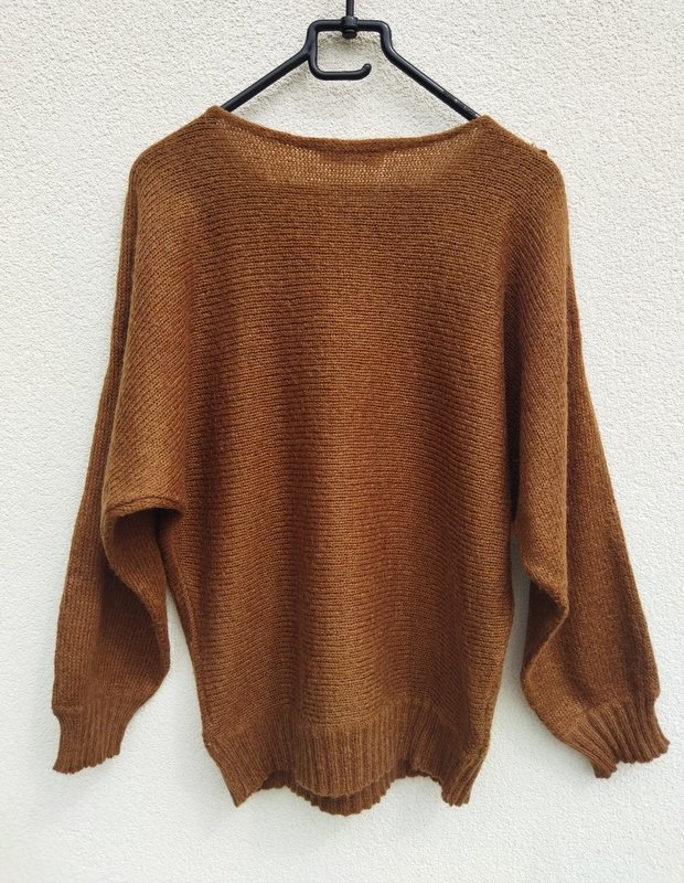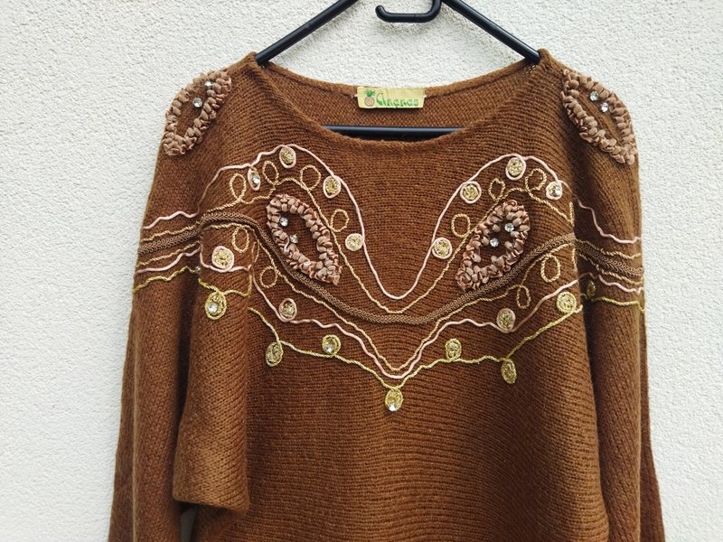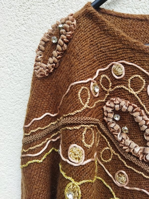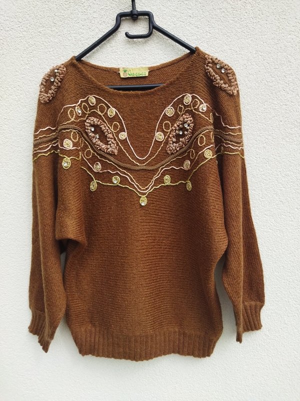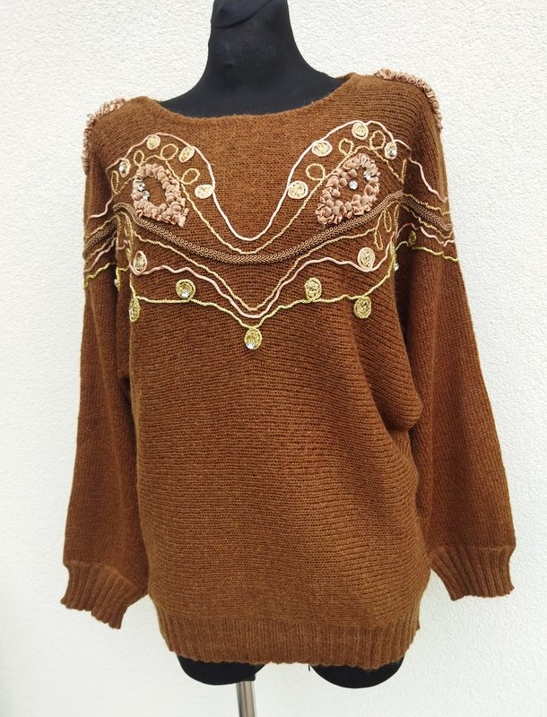 Ciekawy dobrej jakości sweter o fasonie nietoperza z rękawami bez szwów przyramiennych, w kolorze mlecznej czekolady , z biżuteryjnymi zdobieniami, haftami i aplikacjami . Owalny dekolt . Wykończony ściagaczami.