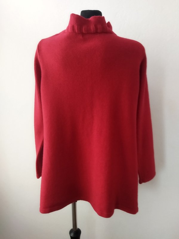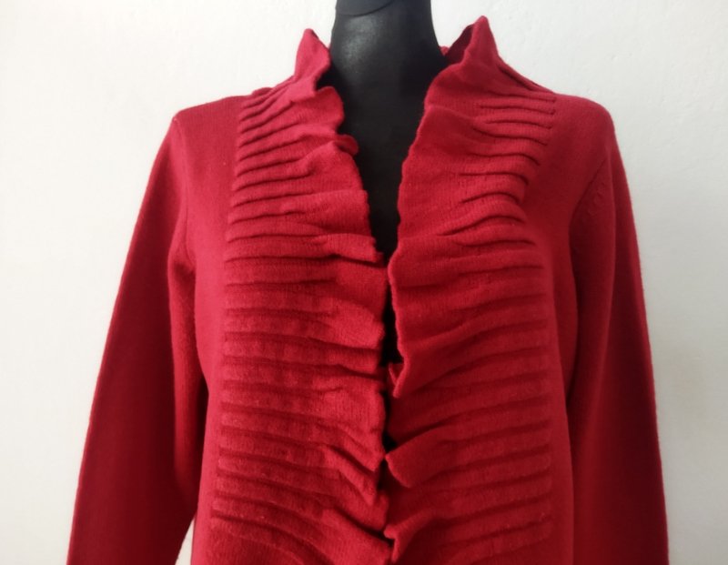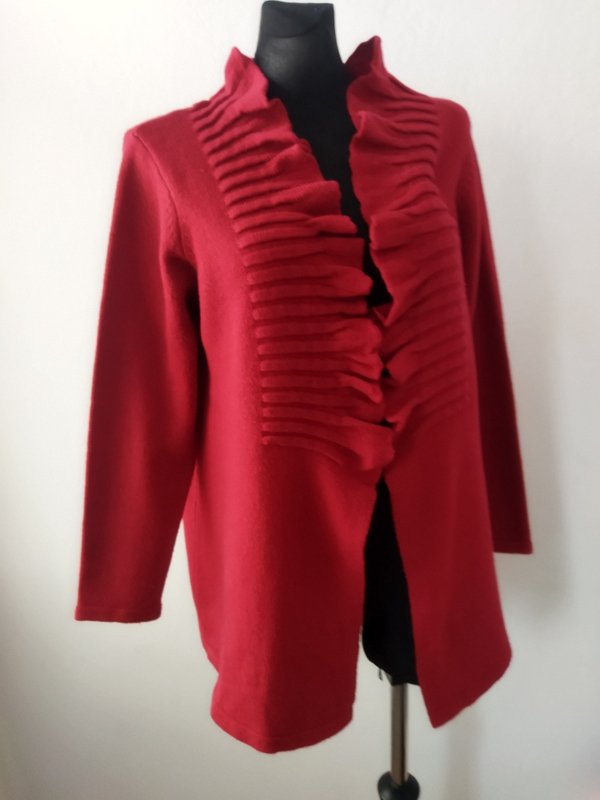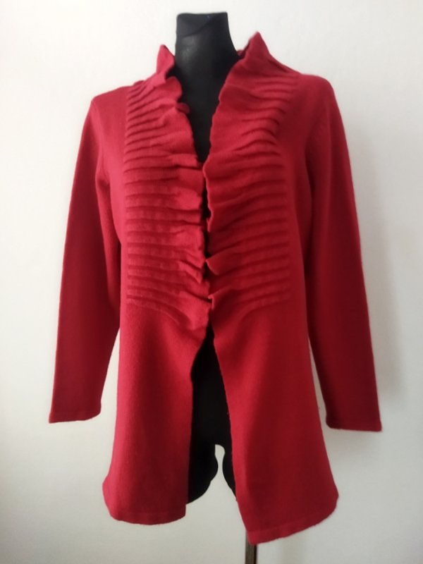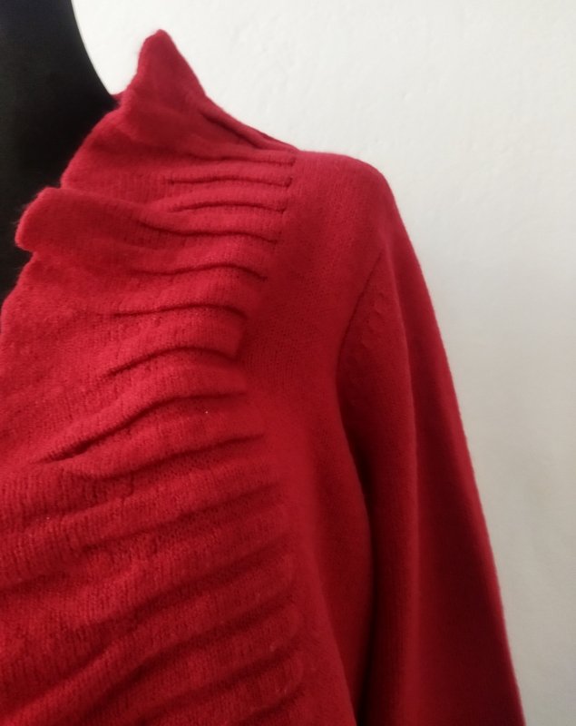 Dobrej jakości sweter z wełny i akrylu w czerwonym kolorze z drapowanymi połami przodu. Zapinany od wewnątrz na haftki.
