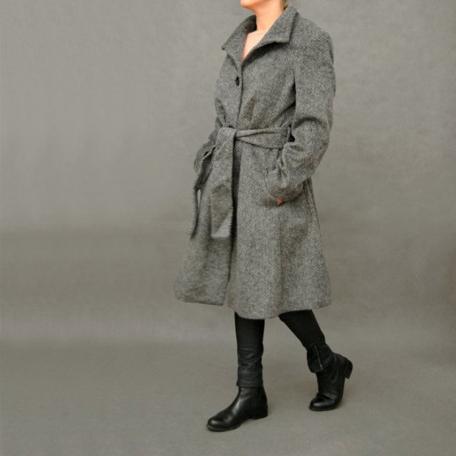 Nowy płaszcz w szarą jodełkę. Wiązany w talii, z kieszonkami. Można zapiąć pod szuję.
