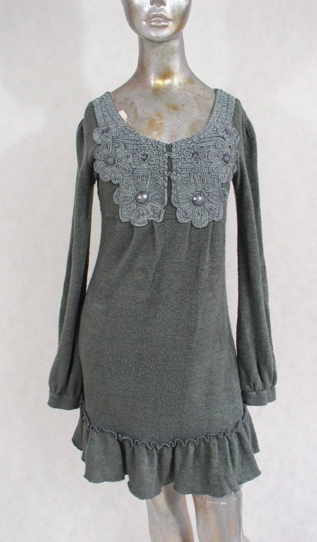 Sukienka z dzianiny firmy Angel.Rozmiar S/M.Włóczka 60% bawełna+40% polyester.Przód odcięty pod biustem,ozdobiony naszytą taśmą+guziki.Dół wykończony falbaną.Rękaw długi zebrany w mankiet+3 zakładki na ramieniu.Stan dobry+.Długość 88 cm.pod pachami 98 cm.