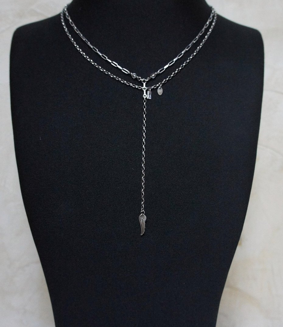 Naszyjnik wykonany ze srebra [pr. 925] w połączeniu z fasetowanymi kryształami górskimi [4mm] bagietką cyrkonii oraz skrzydełkiem . Całość oksydowana i przetarta. Całkowita długość łańcuszka około 46,5cm[ po krótszym obwodzie]. Długość części wiszącej 12cm.Biżuteria ozdobnie zapakowana