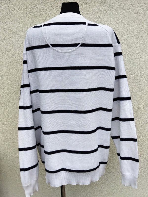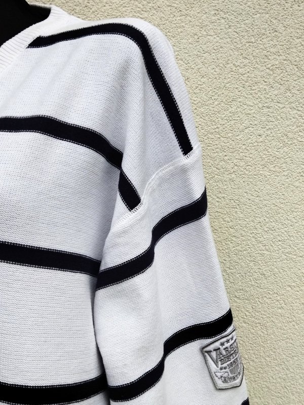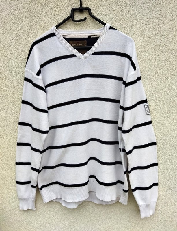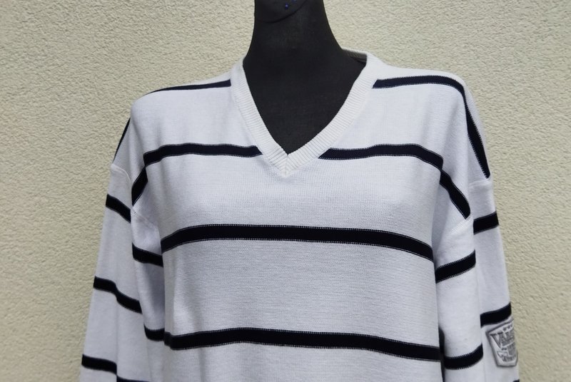 Bawełniany sweter w białym kolorze w ciemnogranatowe prawie czarne paseczki. Dekolt w szpic. Wykończony ściągaczami.