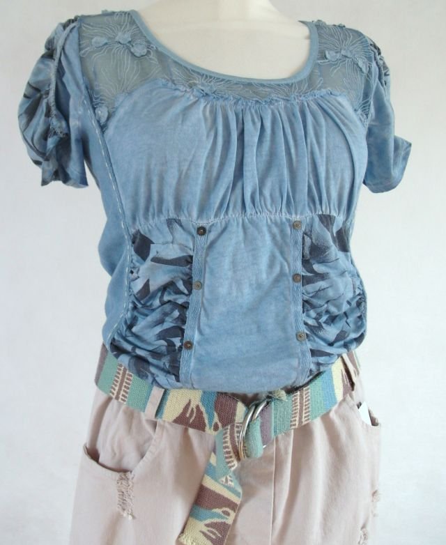 kolor - mleczny morski, super do beżu ,bieli.przy dekolcie koronka, łączone różne materiały, marszczenia oraz delikatne dżety.