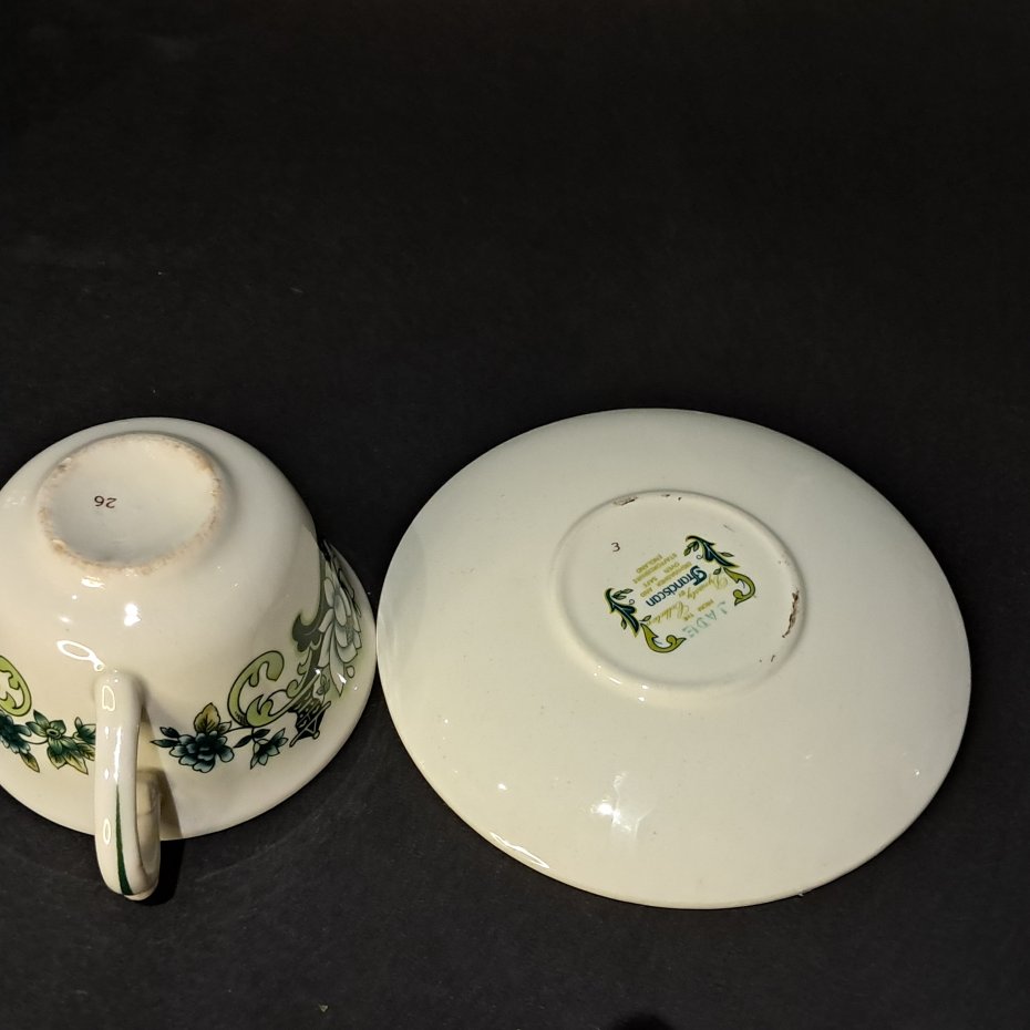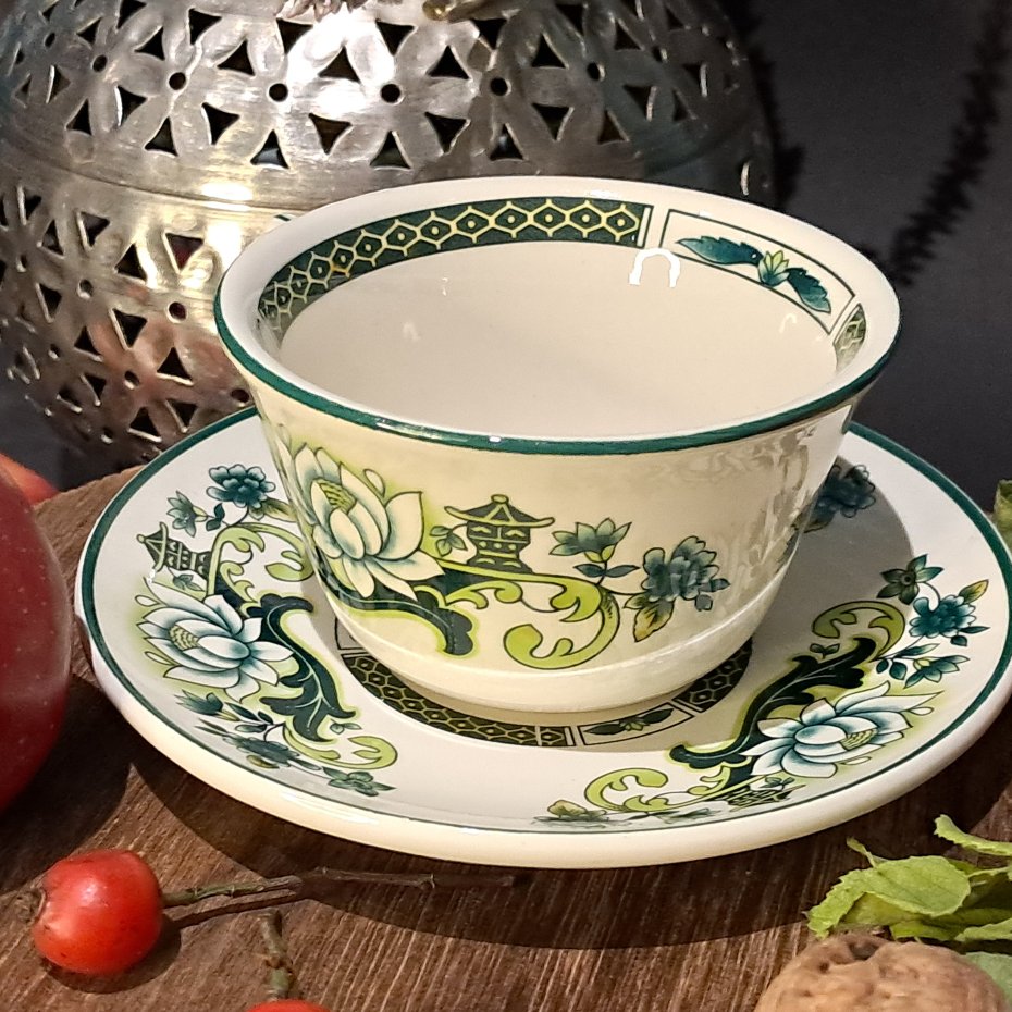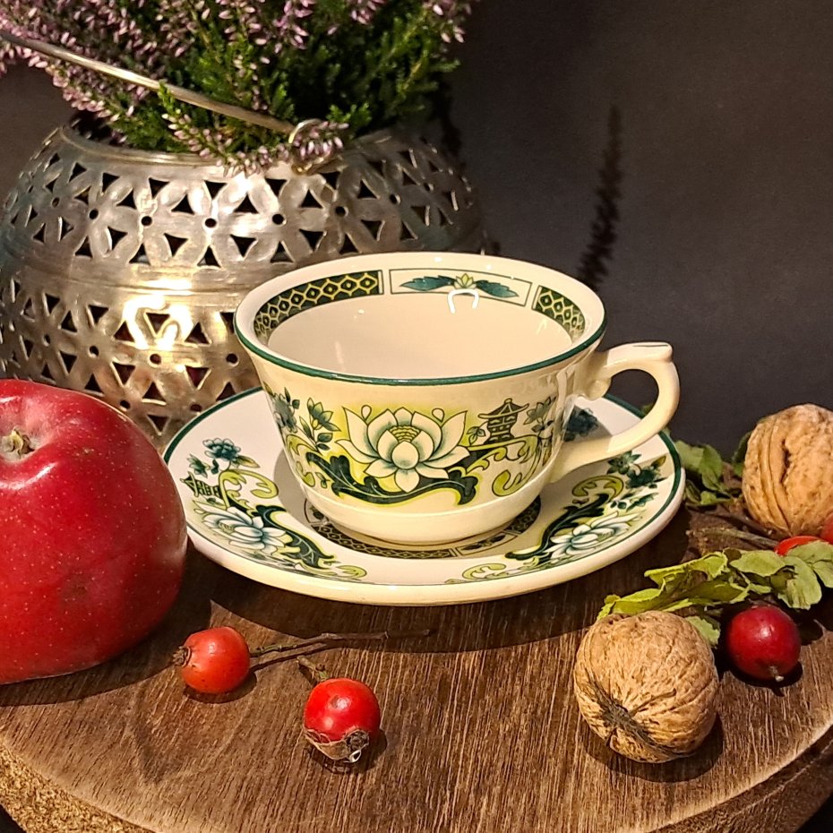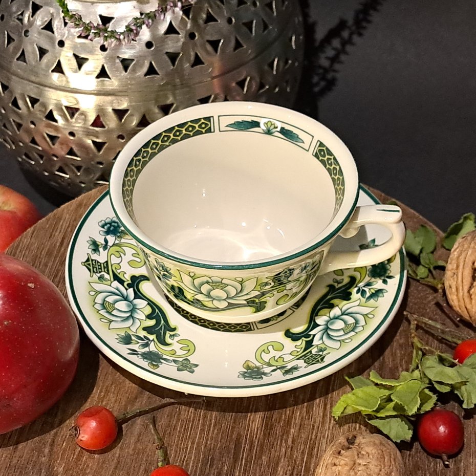 Wzór "Jade" charakteryzuje się motywem kwiatu lotosu w odcieniach zieleni, żółci i bieli, umieszczonym centralnie na filiżance i spodku. Całość jest otoczona geometrycznym, greckim wzorem meandra w kolorze zielonym na białym tle, zarówno na górnej krawędzi filiżanki, jak i na brzegu spodka.