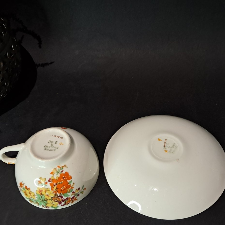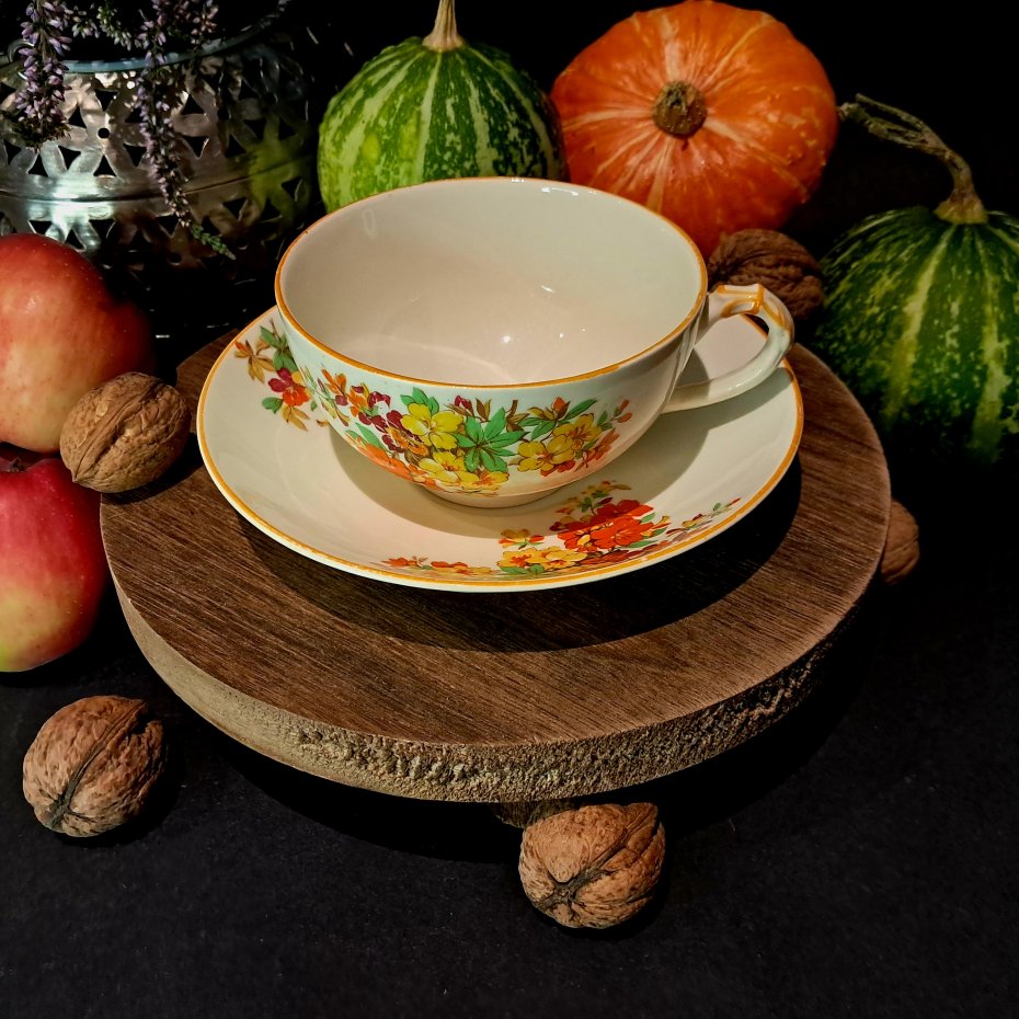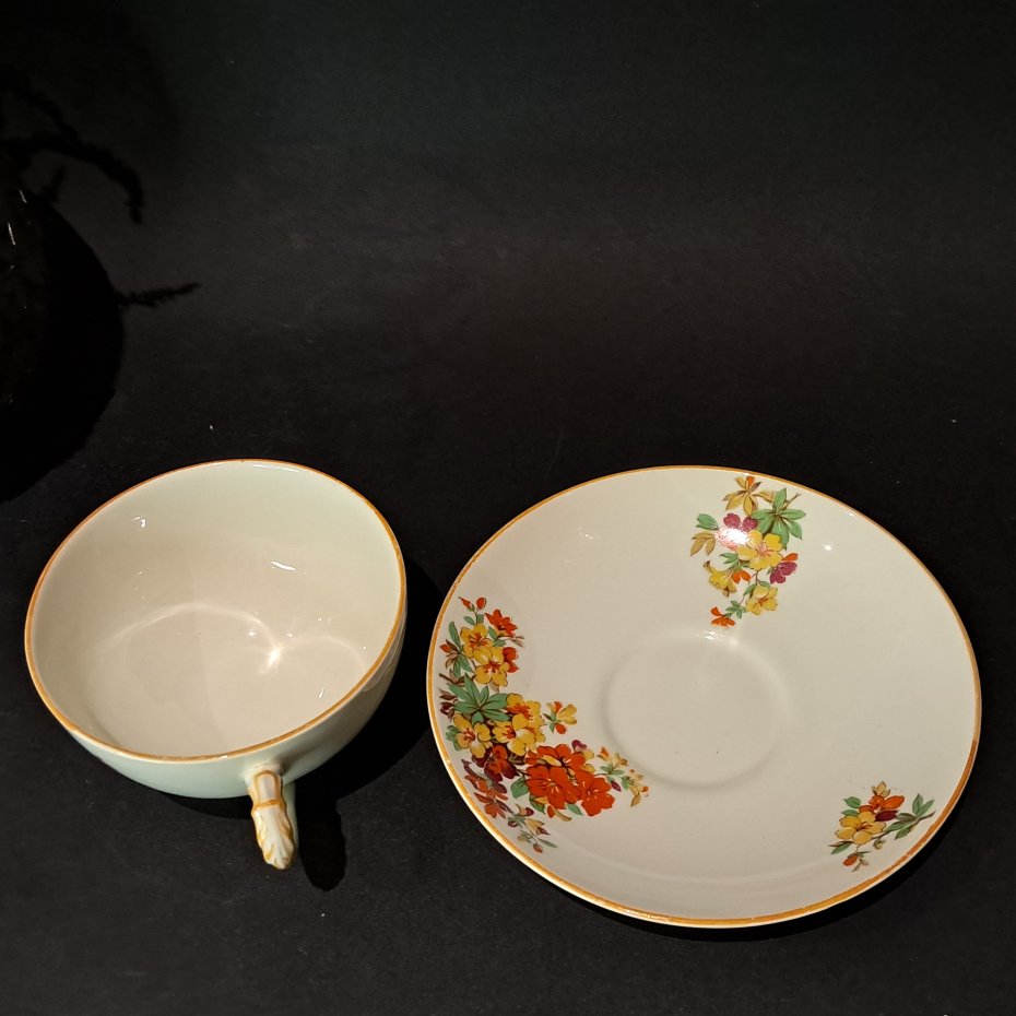 Na filiżance i spodku widoczny jest ręcznie malowany wzór kwiatowy, przypominający bukiety kwiatów w odcieniach żółci, pomarańczy i czerwieni.