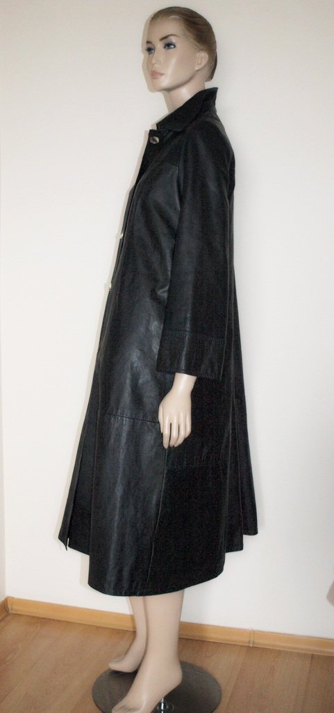 śliczny, czarny płaszcz z naturalnej, mięsistej skóry. wąska góra, reszta kloszowa, kieszenie do wewnątrz. skóra i wnętrze w świetnym stanie. Stosunkowo krótki rękaw rozszerzony na dole. pod spodem pikowana podszewka z cienką warstwą ocieplenia. myślę, że powinien pasować na małe 38. Prezentowany na manekinie o rozmiarze 38.