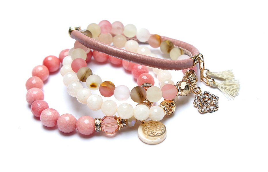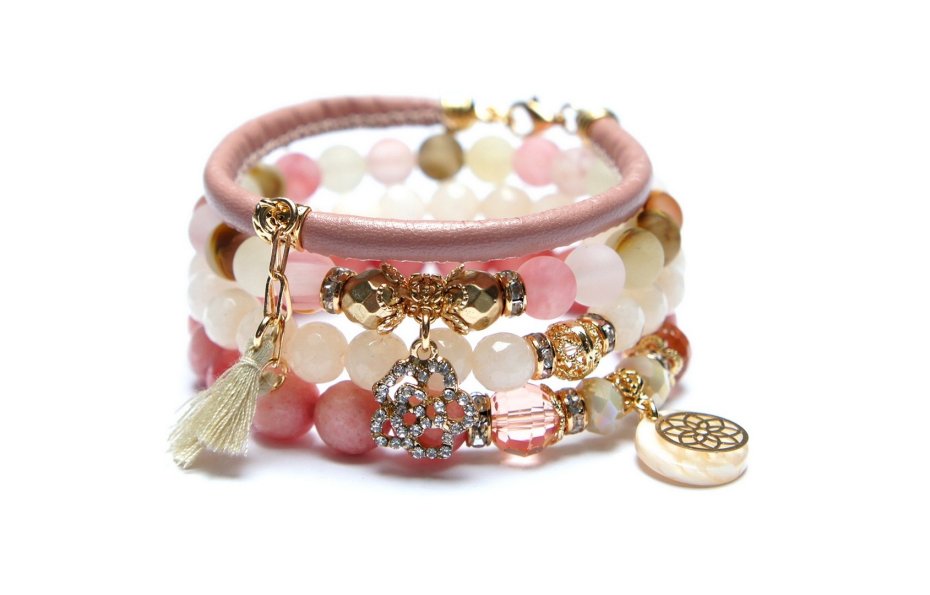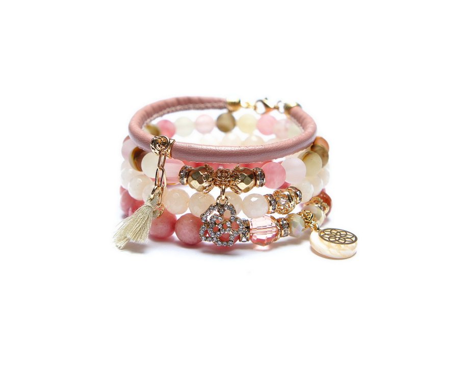 Komplet czterech bransoletek wykonanych z naturalnych kamieni: jadeity [8 i 10mm], kwarc matowy [8mm], kryształków fasetowanych [8 i 10mm], hematyt fasetowany, platerowany [8mm], rzemienia z naturalnej skórki, zawieszki wysadzanej cyrkoniami, chwostów, zawieszki z żywicy oraz elementów metalowych w kolorze złota. Bransoletki pasują na nadgarstek 16 - 17cm.