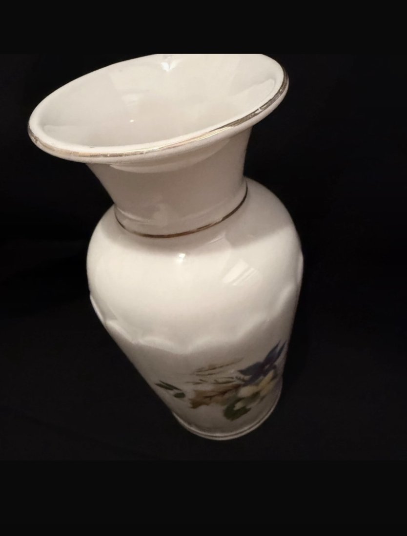Porcelanowy z porcelany kostnej flakonik zdobiony reliefami , złotymi obwódkami oraz motywem kwiatowym , pod spodem sygnowany wys 13,5 cm