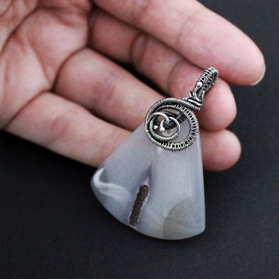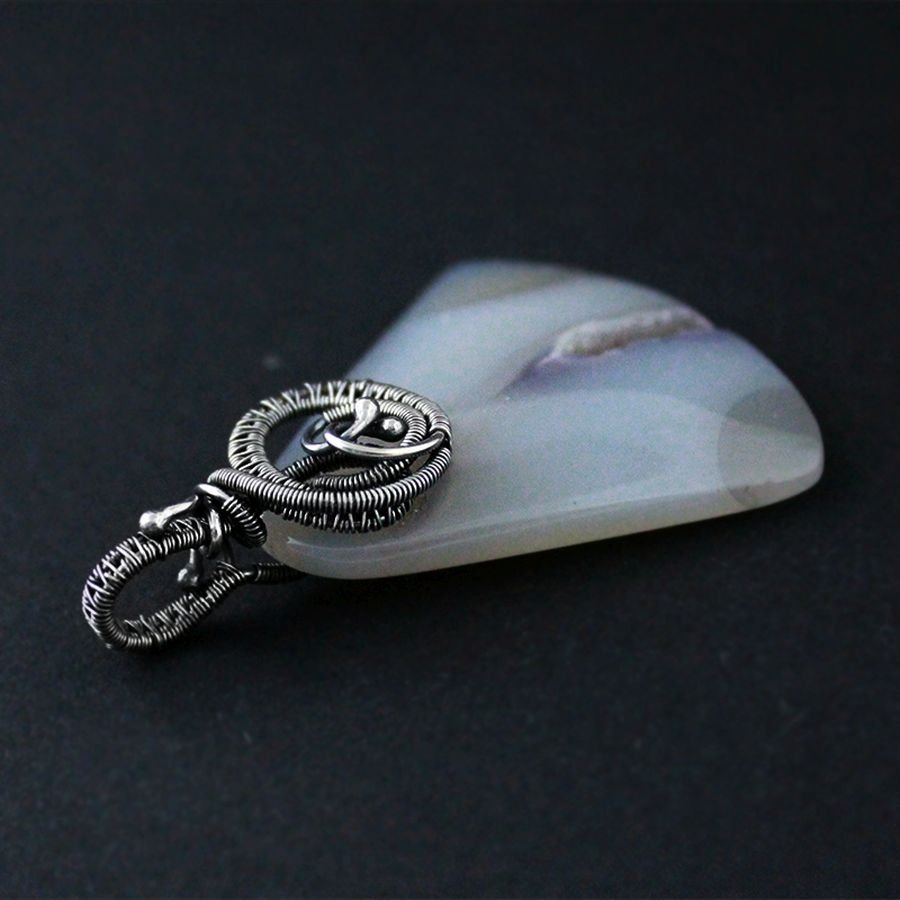 Oplot wykonany został techniką wire-wrapping – misterną metodą ręcznego oplatania drutem, wymagającą precyzji i artystycznego wyczucia. Oksydowane i częściowo wypolerowane srebro tworzy grę jasnych i ciemnych tonów, harmonizując z barwą kamienia i podkreślając jego naturalne piękno. Każdy element oprawy został dopasowany do kształtu agatu, tworząc spójną, organiczną kompozycję.