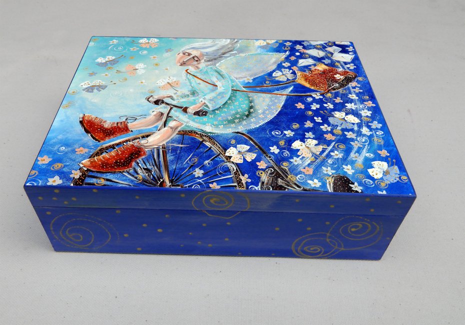 Drewniane pudełko na różności z reprodukcją obrazu autorskiego pt. "Anioł dobrych wiadomości". Obraz umieszczony jest metodą decoupage na wierzchniej części szkatułki, boki natomiast malowane są ręcznie. Całość zabezpieczona jest bezbarwnym lakierem oraz sygnowana w środku.