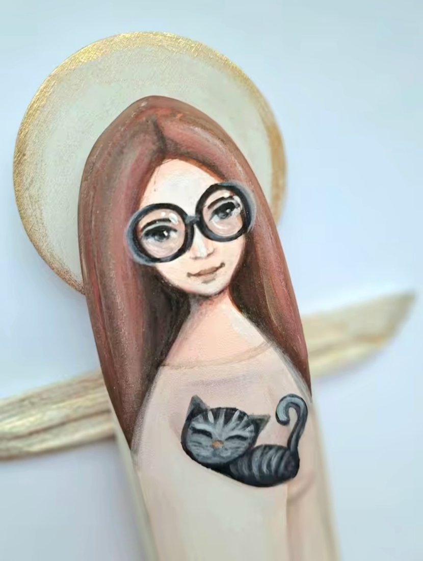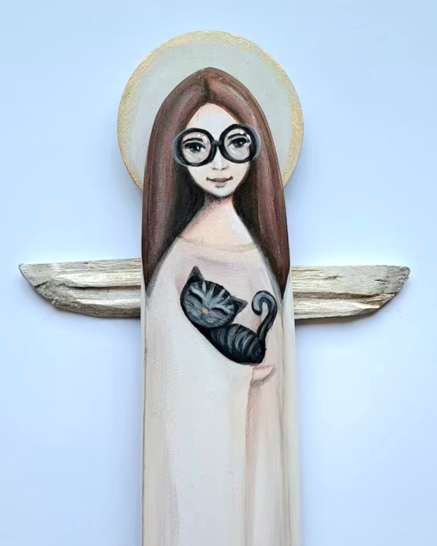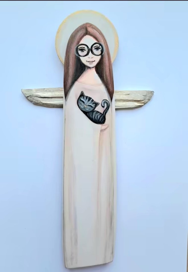 Pozłacany Anioł Mądrości w okularach, z uroczym, śpiącym kotkiem.