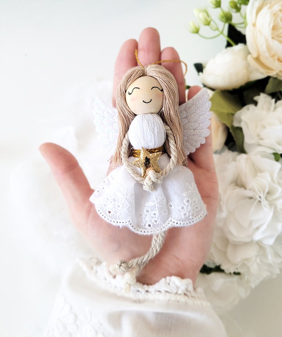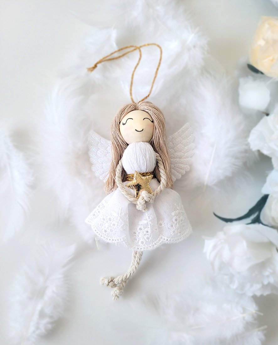 Uroczy Aniołek makramowy na choinkę lub do stroiku z białymi brokatowymi skrzydełkami.