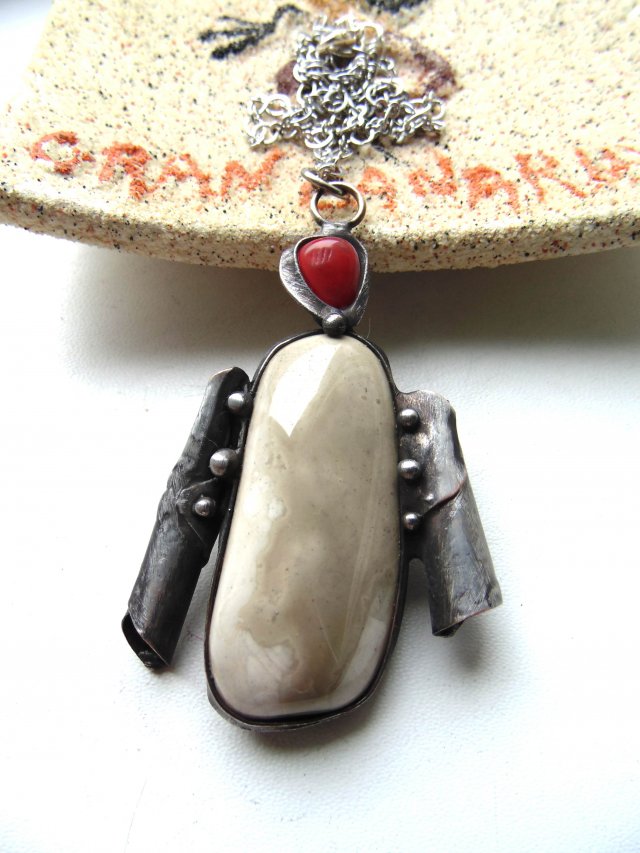 Wisior wykonany techniką witrażową z koralowca i krzemienia pasiastego. Zawieszony na łańcuszku z przedłużką. Wymiary ok. 7,5 na 4 cm.