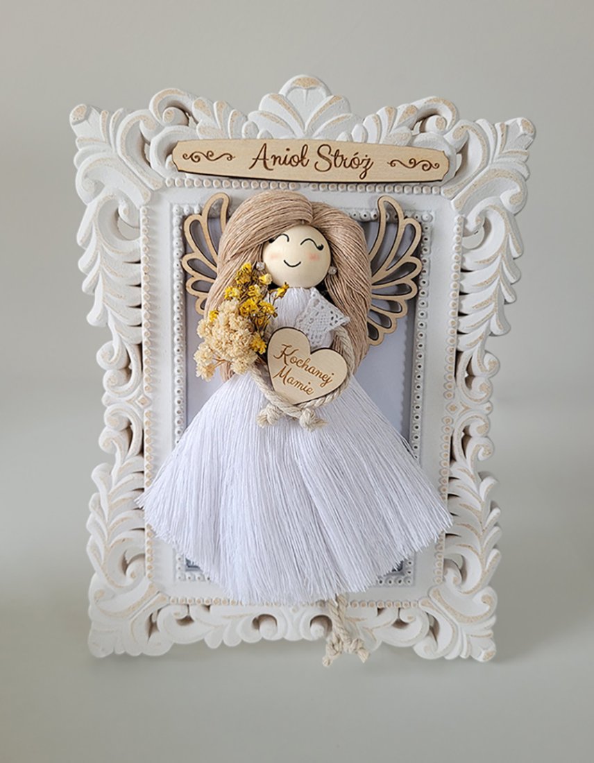 Piękny Anioł Stróż wykonany w technice makramy w ramce to idealny prezent na urodziny lub inną okazję.