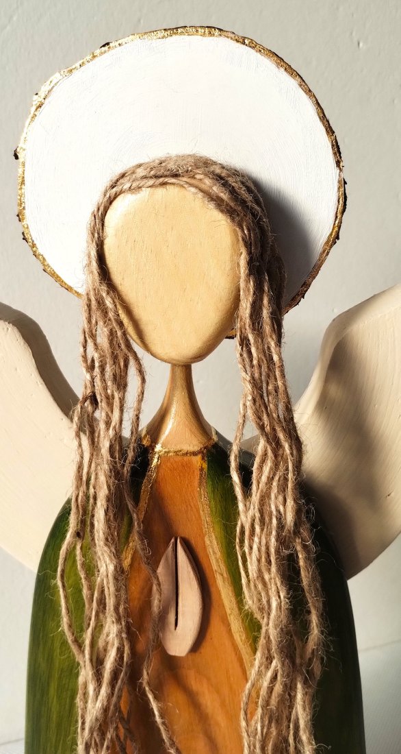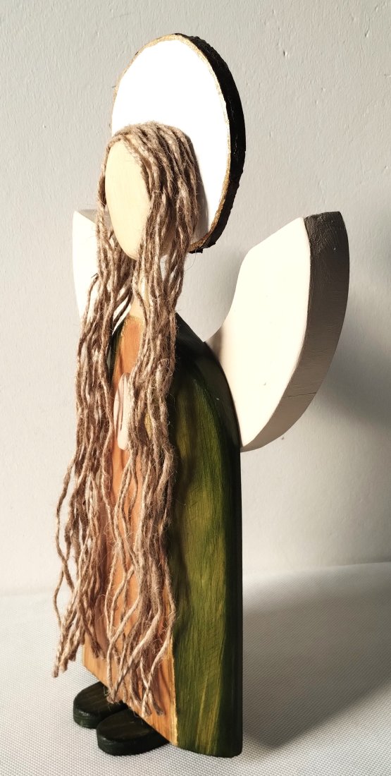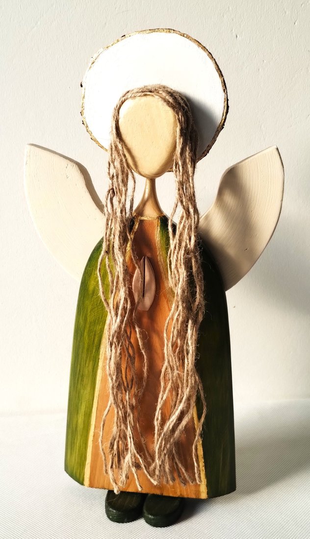Anioł z drewna sosnowego , barwiony bejcą wodną i zabezpieczony lakierem akrylowym.Skrzydła i aureola malowane akrylową farbą. Powstał on z myślą o wprowadzeniu do domu spokoju i ciepła. Jest symbolem opieki, wdzięczności i harmonii, takim małym przypomnieniem, że warto zatrzymać się na chwilę w codziennym pośpiechu. To idealny prezent pod choinkę dla kogoś, komu chcesz podarować nie tylko dekorację, ale także intencję bliskości i dobrego czasu.