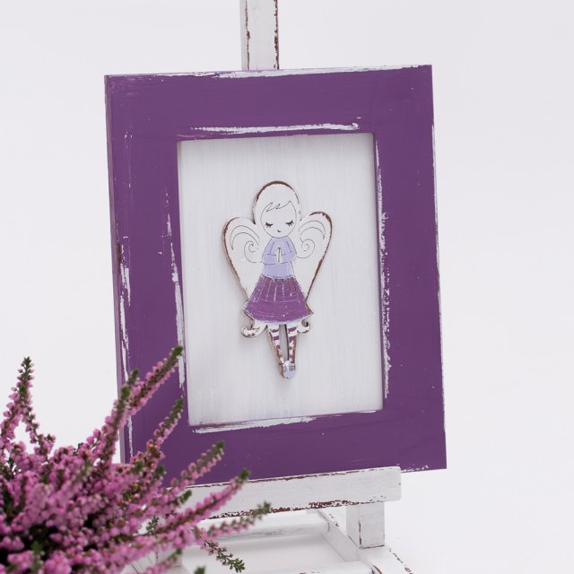 Anioł o dziewczęcym uroku w drewnianej ramce, całość ręcznie malowana. 21 cm x 25 cm wymiary wewnętrzne 12,5 cm x 17 cm