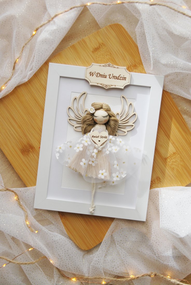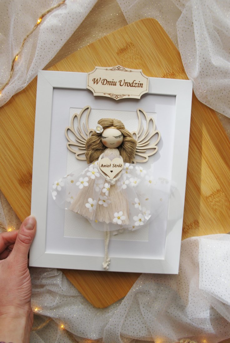 Szukasz prezentu na urodziny, który wywoła uśmiech, wzruszy i zostanie w sercu na długo? Oto on - makramowy aniołek w eleganckiej ramce, stworzony z dbałością o każdy detal.