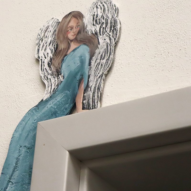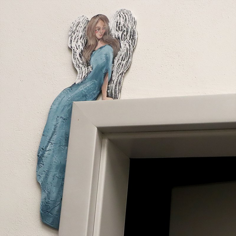 Anioł ręcznie malowany na drewnianej, dociętej do kształtu płycie. Wymiar ok. 50 cm x 19 cm x 5 mm. Można go umieścić na futrynie bądź ramie lustra czy półce z kantem. Widoczna faktura na skrzydłach i szacie. Każdy z moich Aniołów jest oryginalny, niepowtarzalny, ma swój własny urok, charakter i osobowość. Doskonały prezent na dla bliskiej osoby.
