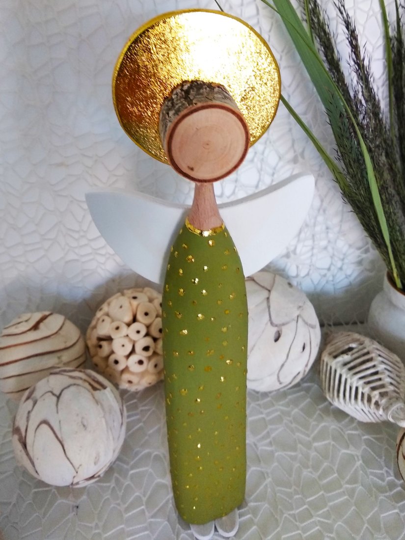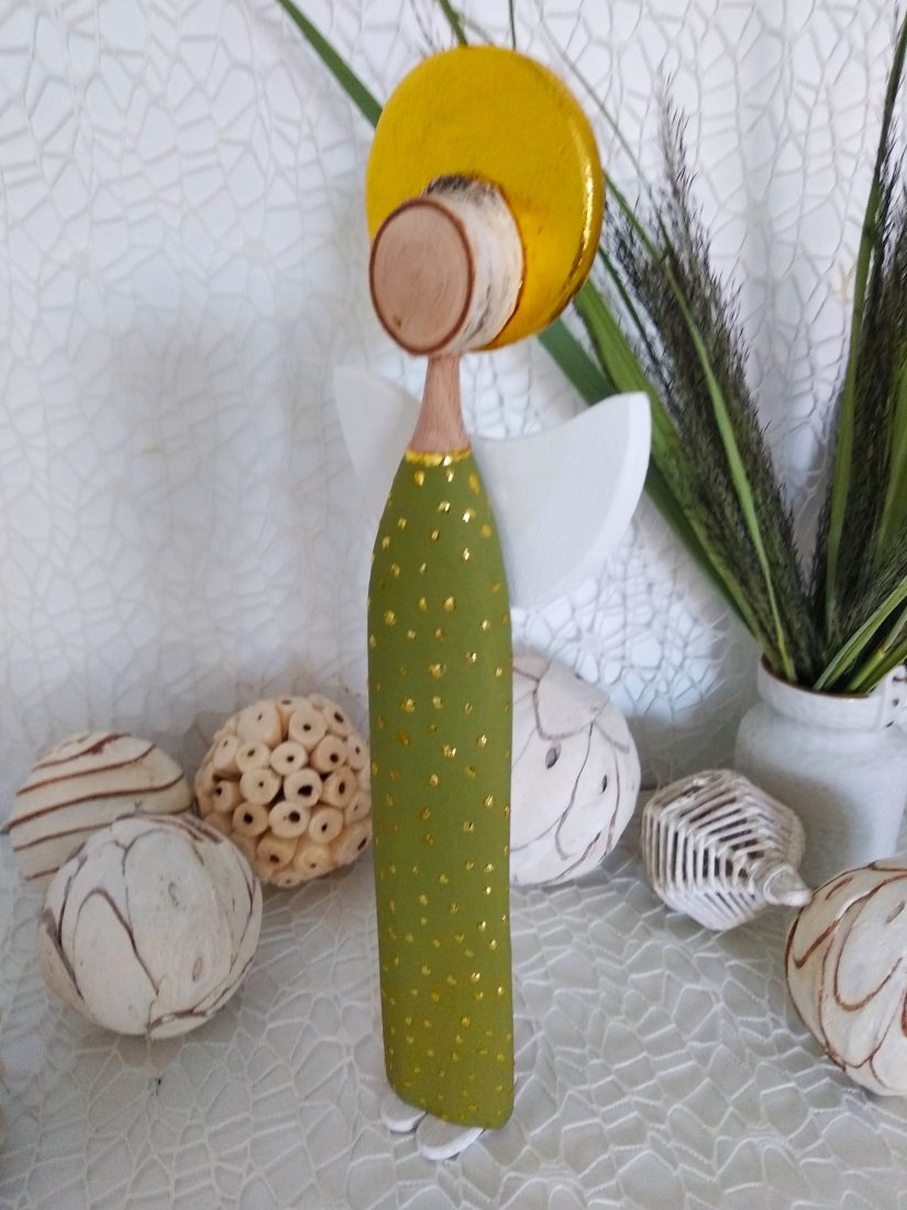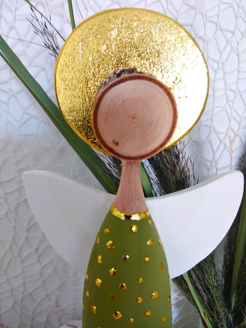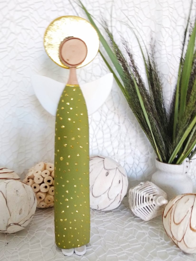 Ręcznie wykonany anioł z drewna bukowego, z sukienką malowaną akrylową farbą w odcieniu zieleni. Złota aureola oraz delikatne, nieregularne kropeczki nadają całości elegancki, lekko rozświetlony charakter.