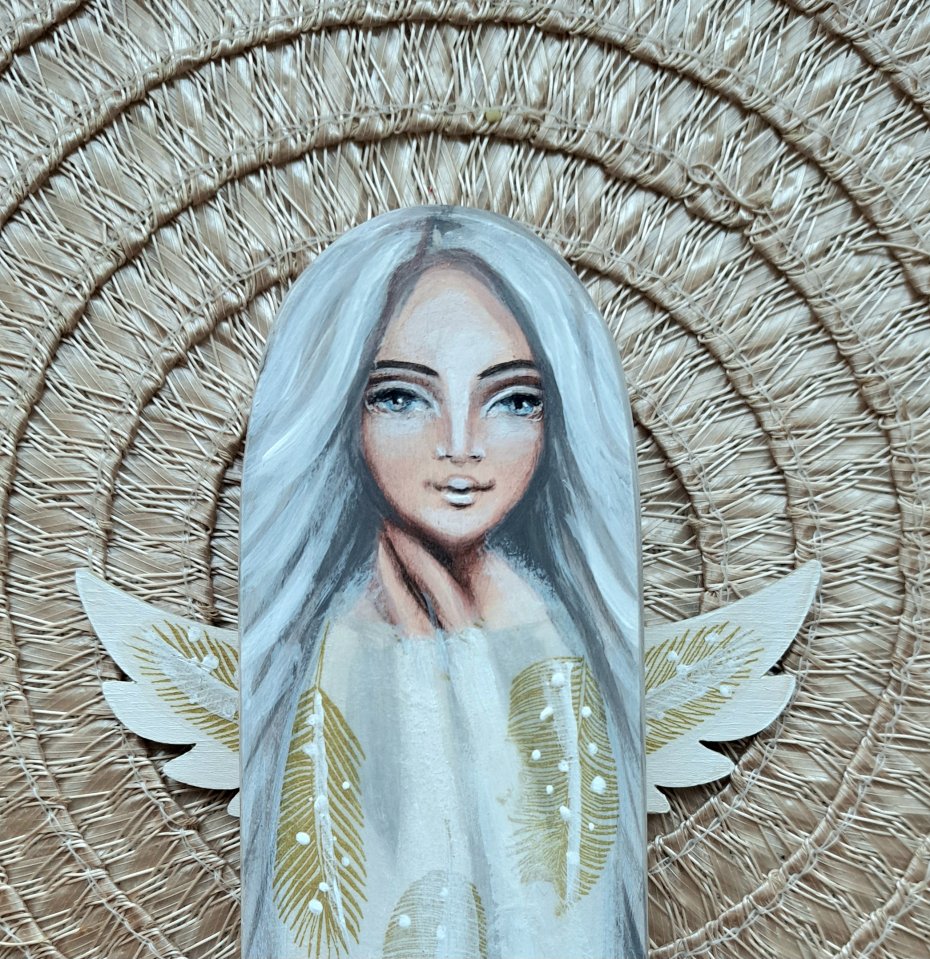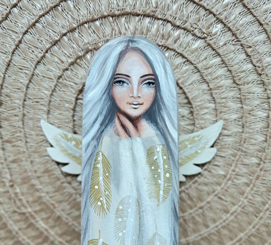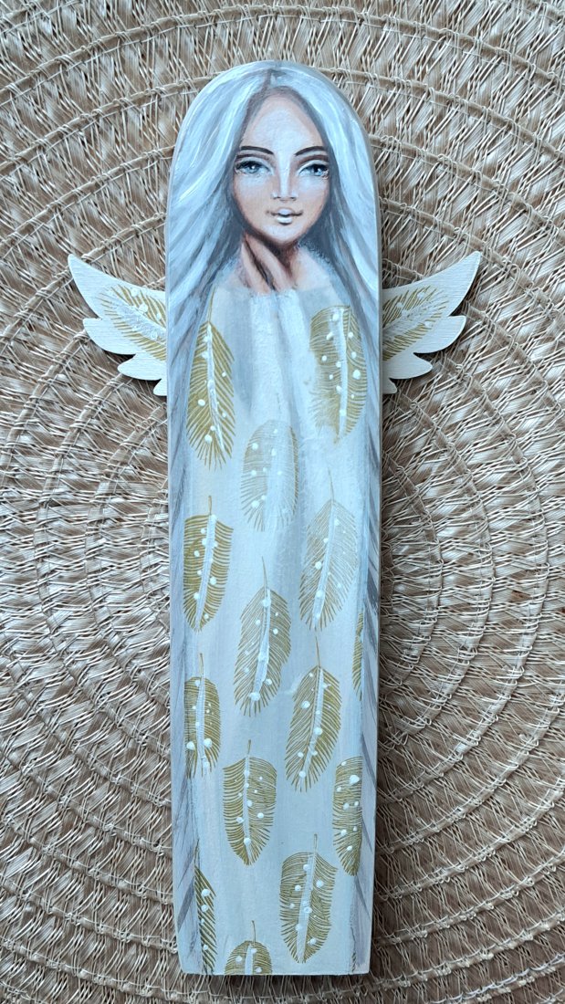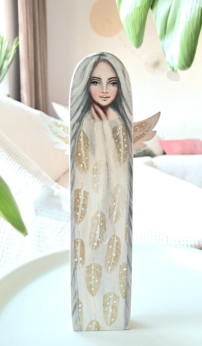 Anioł Wsparcia z siwymi włosami, w sukni w piórka.