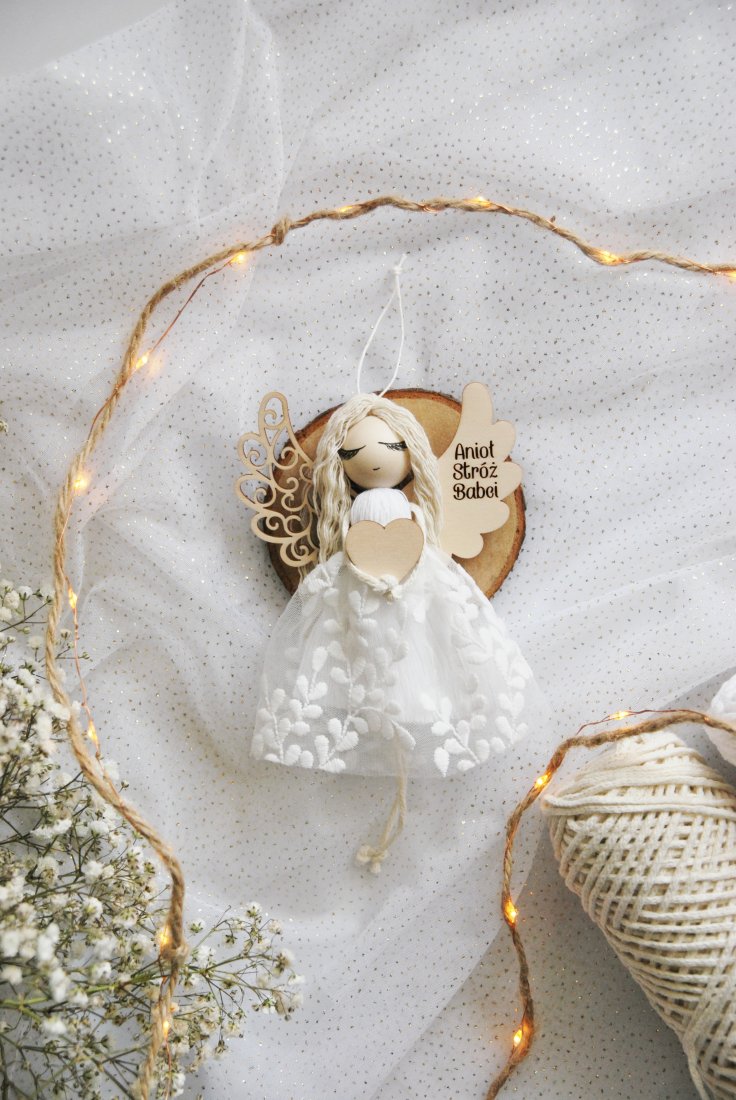 Aniołek wykonany jest z dbałością o każdy detal. Delikatna sukienka, subtelne skrzydełka oraz serduszko sprawiają, że dekoracja ma nie tylko piękny wygląd, ale również głębokie, emocjonalne znaczenie.