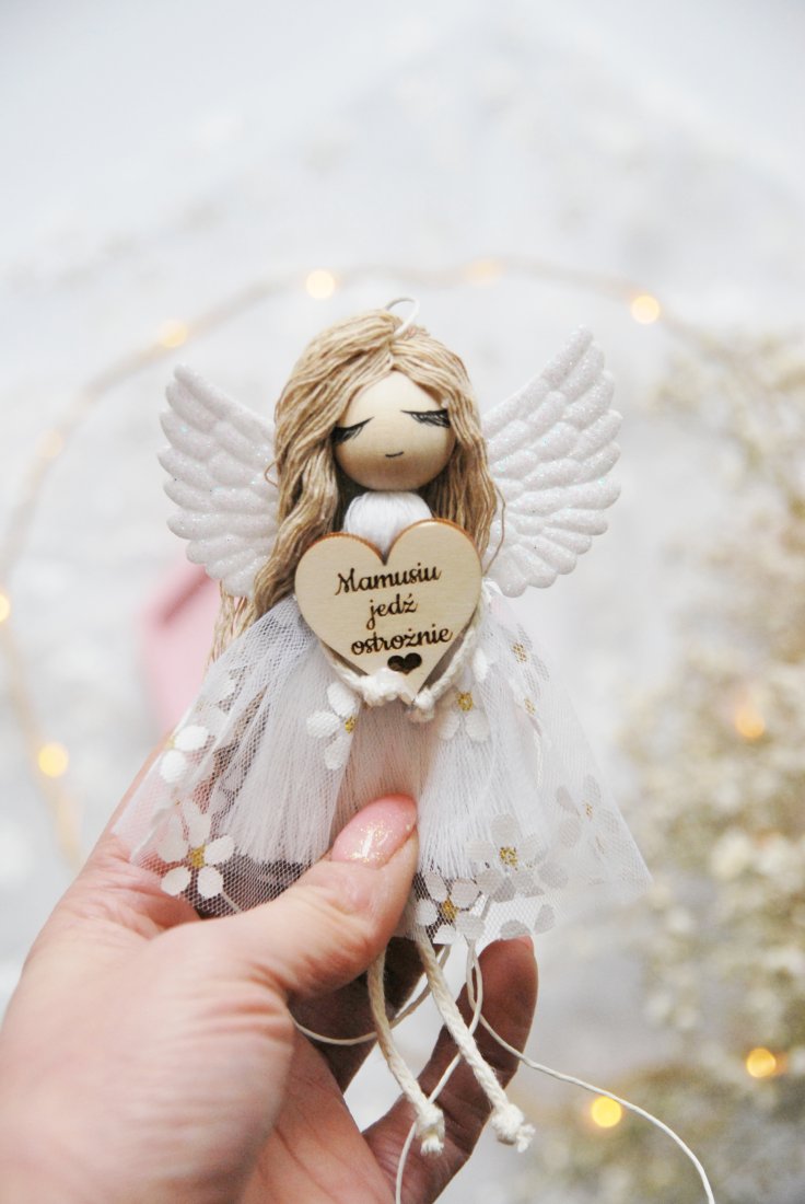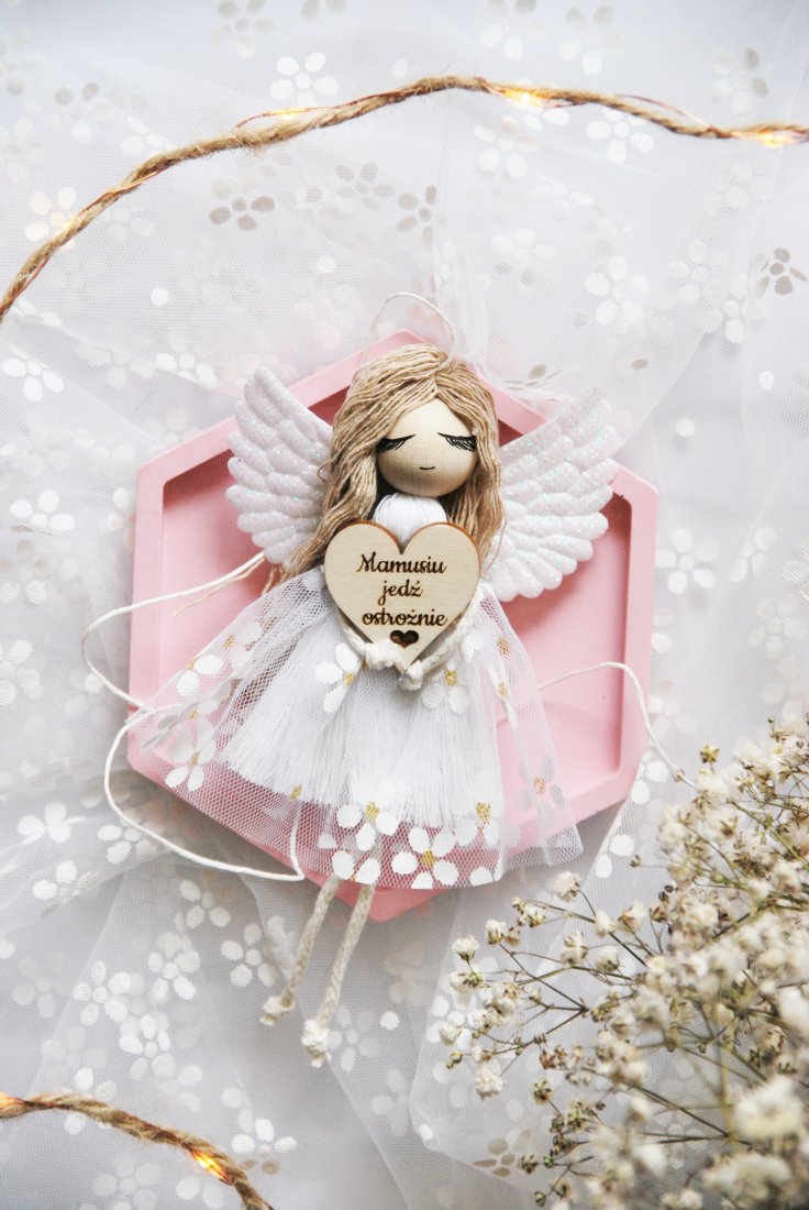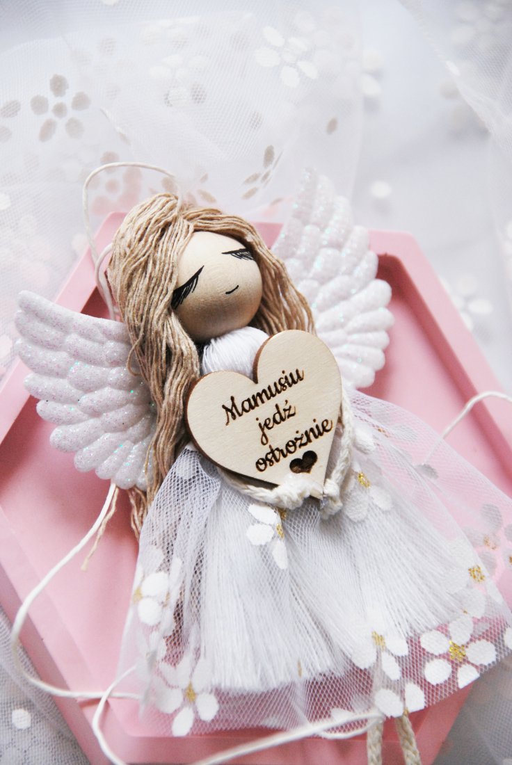 Delikatny, ręcznie wykonany aniołek z miękkimi skrzydełkami i subtelną tiulową sukienką trzyma w dłoniach drewniane serduszko z wygrawerowanym przesłaniem: "Mamusiu jedź ostrożnie". To nie tylko ozdoba do samochodu – to symbol troski, wdzięczności i bezwarunkowej miłości.